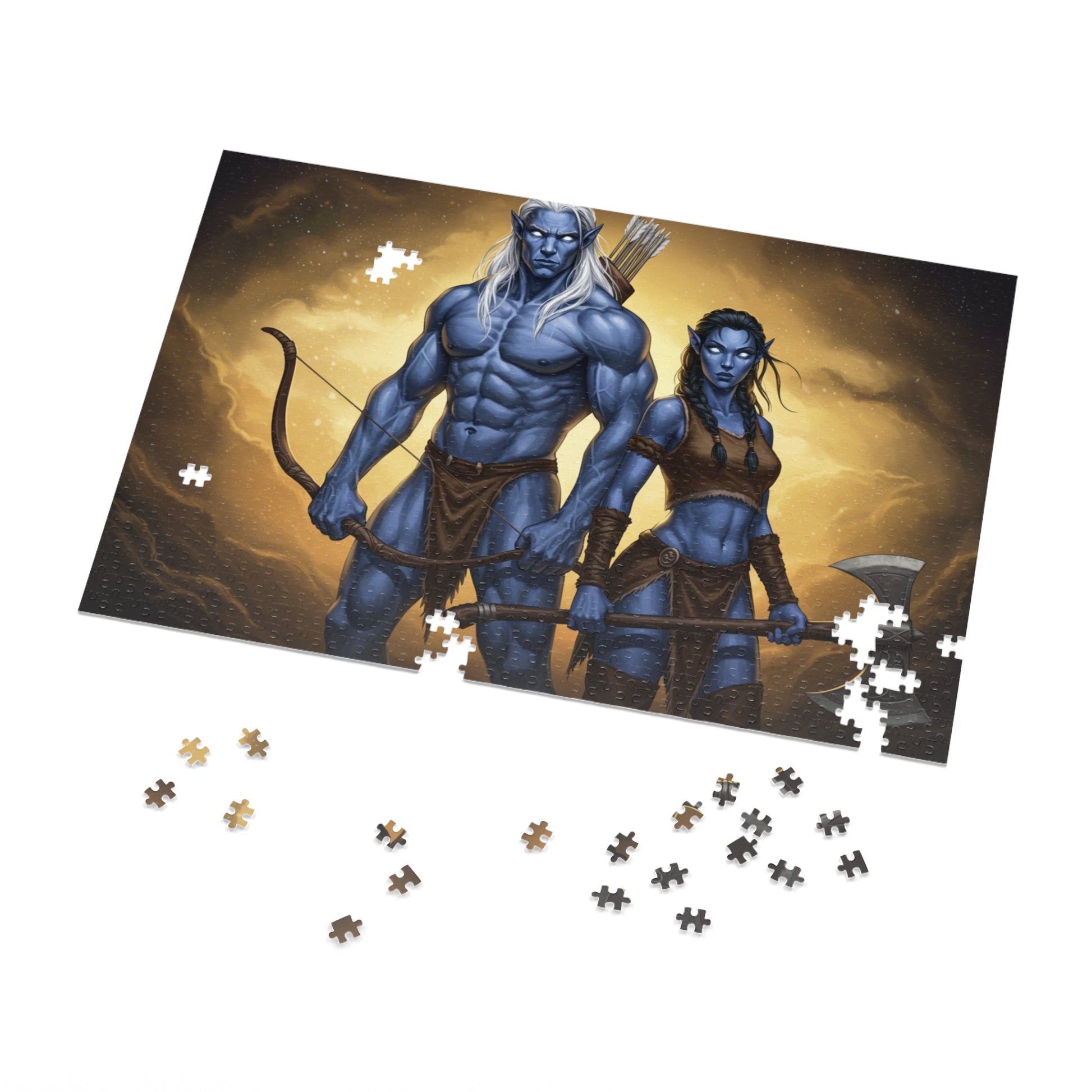 ⚔️ Enter a world of fantasy and strength with this powerful jigsaw puzzle featuring two fierce blue-skinned warriors. Armed with a bow and a massive battle axe, they stand ready for battle under a glowing, stormy sky. This captivating scene radiates courage, mystery, and epic adventure.