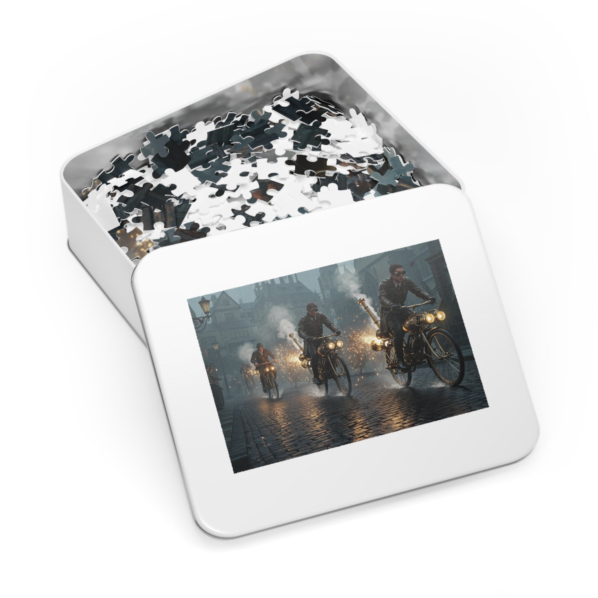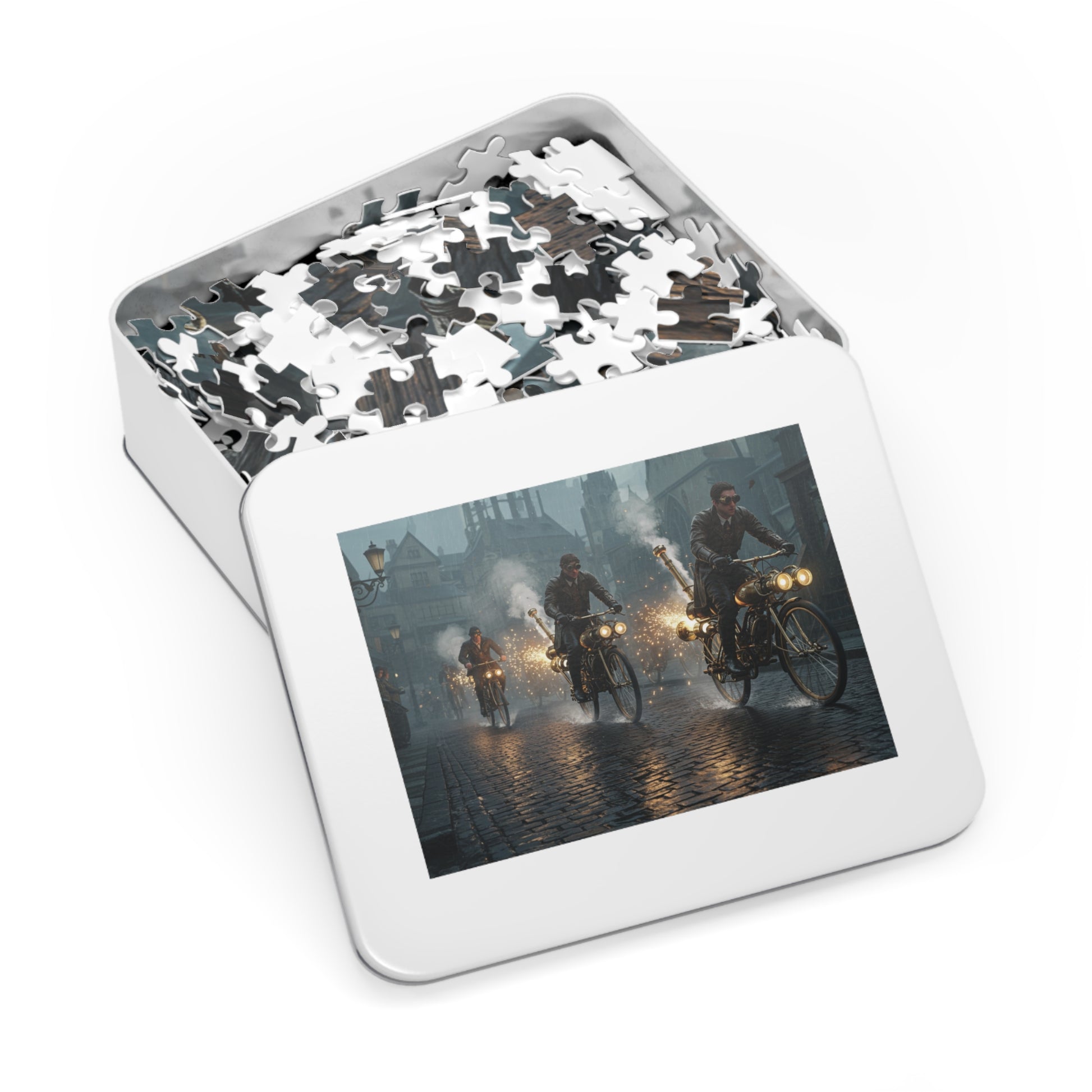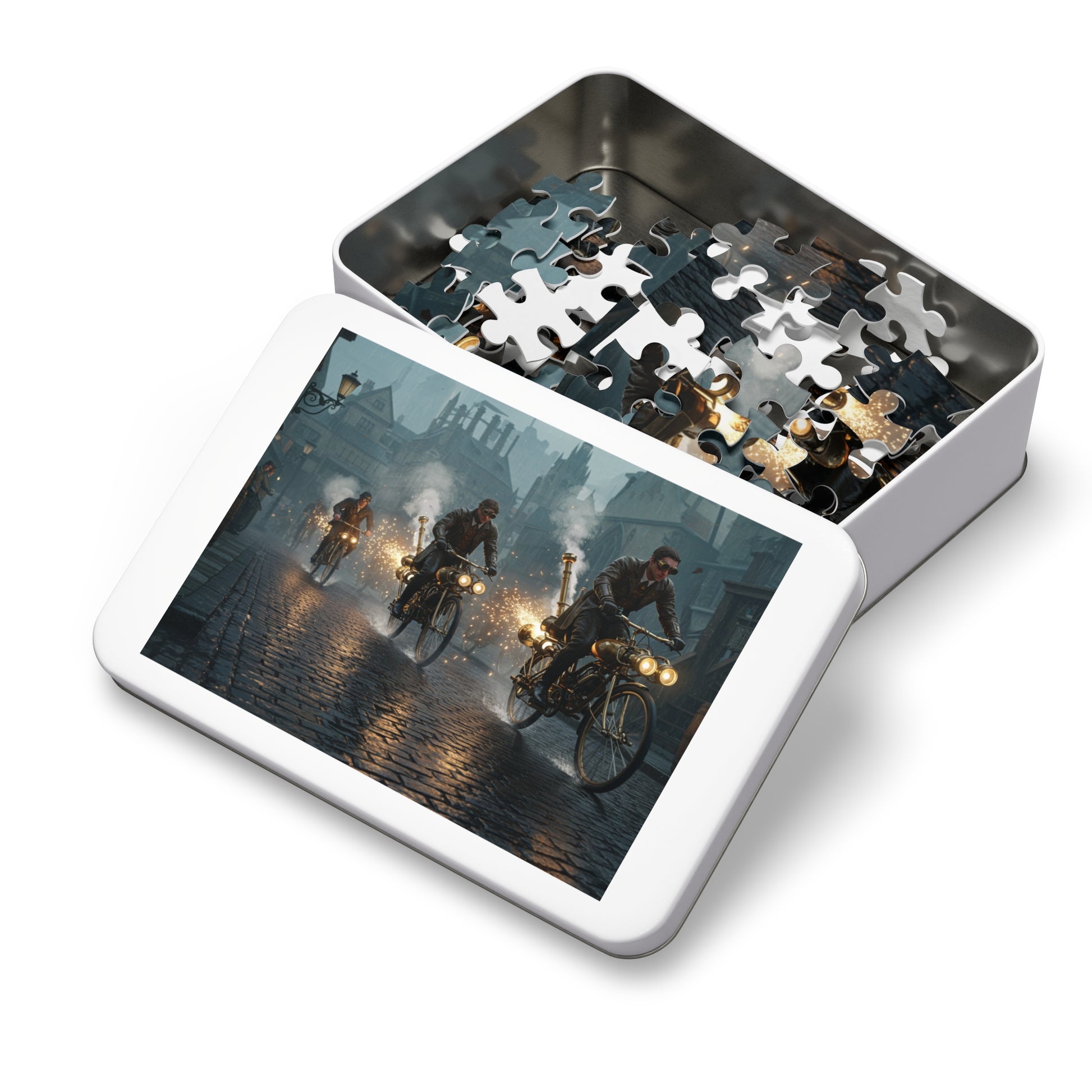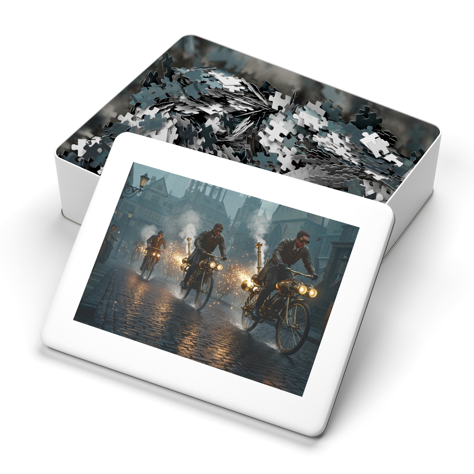 ⚙️ Dive into the thrilling world of steampunk adventure with this dynamic jigsaw puzzle featuring riders on steam-powered bikes racing through rain-slicked cobblestone streets. Sparks fly and smoke billows as they speed through a cityscape filled with Victorian architecture and industrial charm.