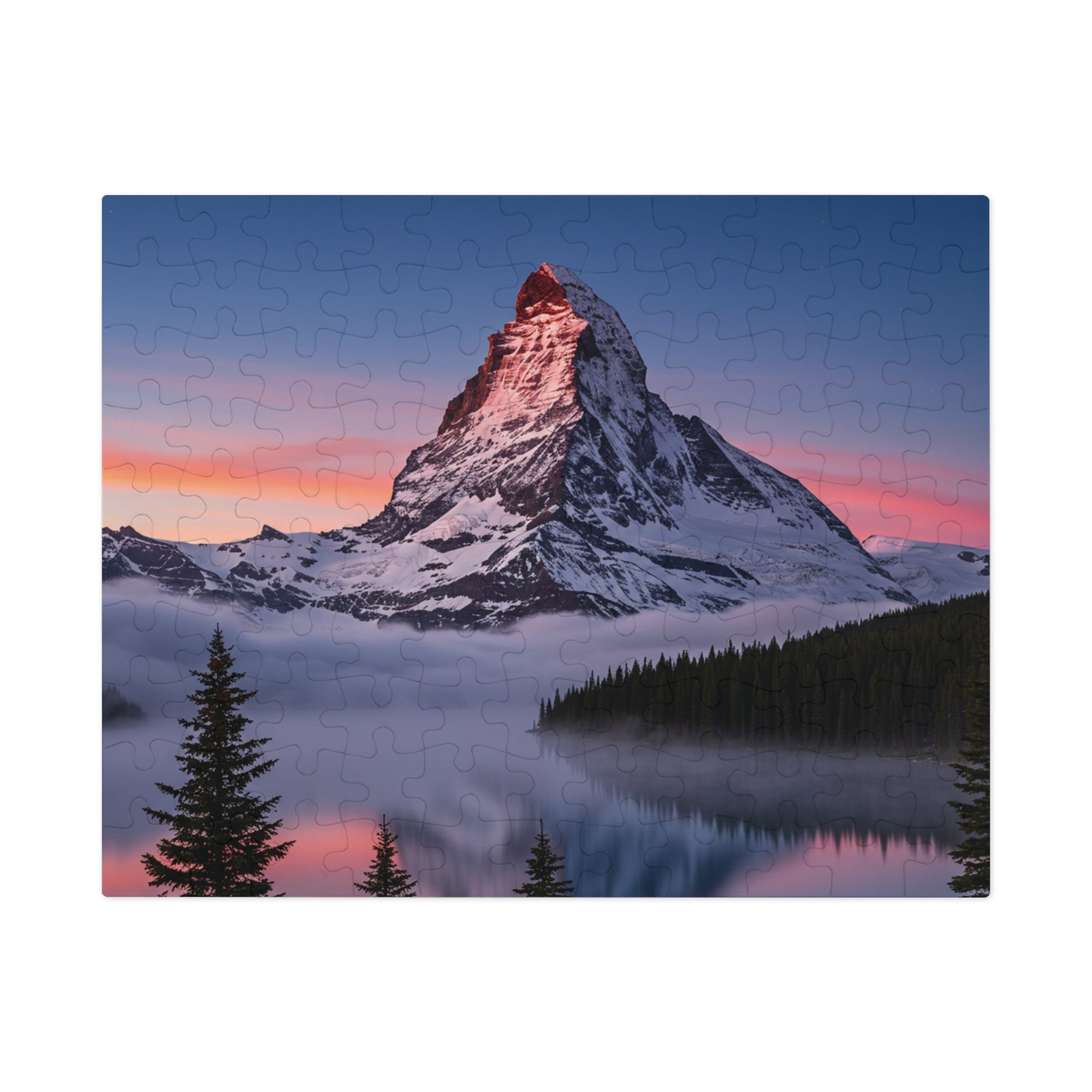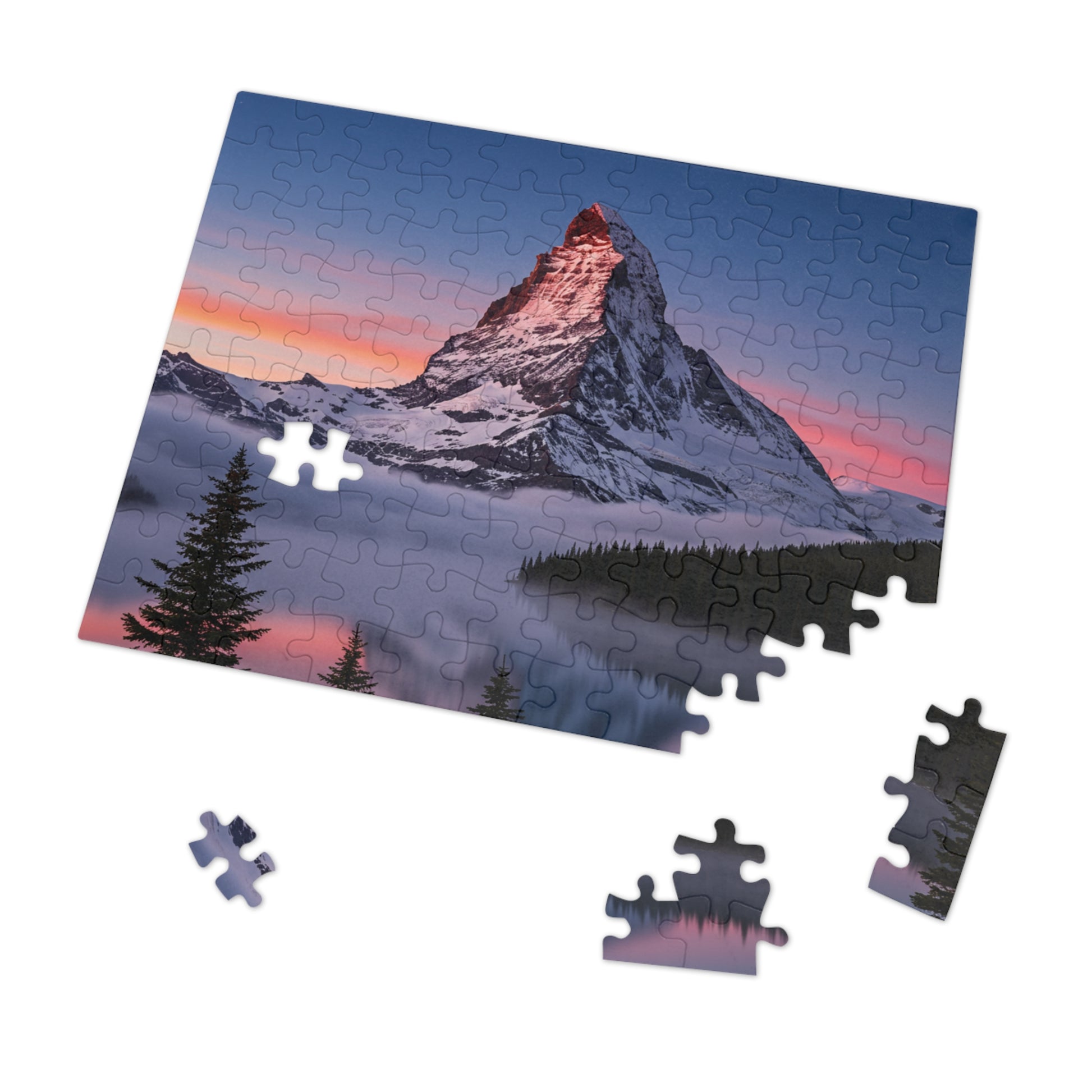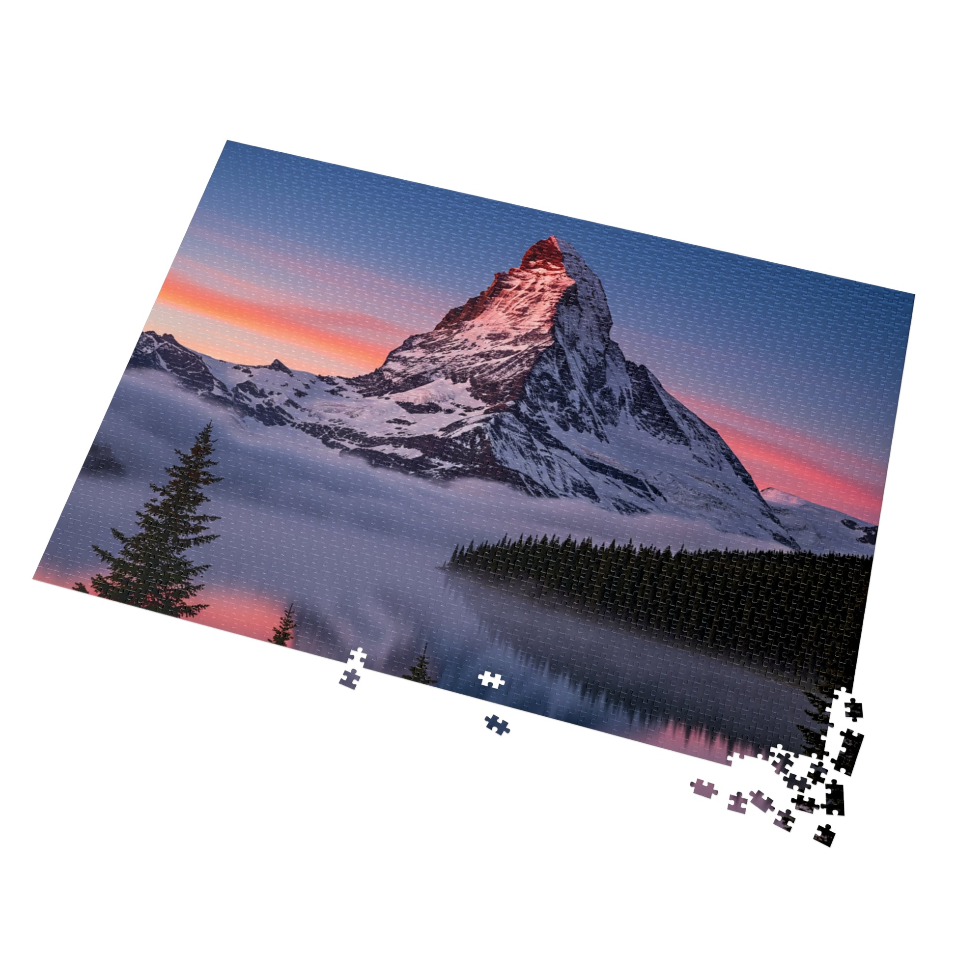 Immerse yourself in a breathtaking mountain landscape with this premium jigsaw puzzle. Featuring a snow-capped peak bathed in golden sunrise and a serene mirror-like lake, this artwork brings calm and wonder to your fingertips.