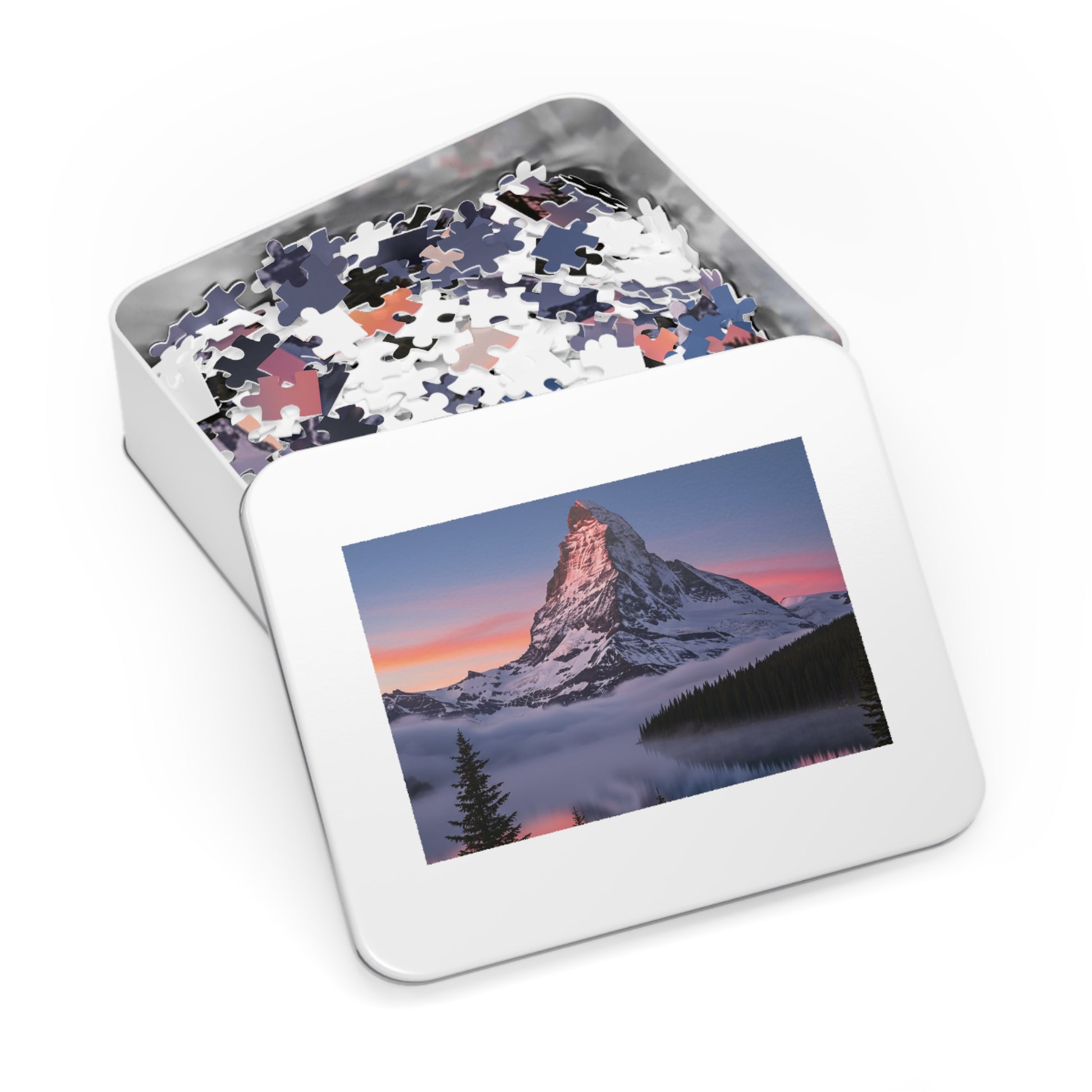 110, 252, 500, 1000, 2000, Snowy Mountain Peak Jigsaw Puzzle – Alpine Majesty & Mirror Lake Sunset Scene, Scenic Nature Puzzle in Gift Tin (252–2000 Pieces)