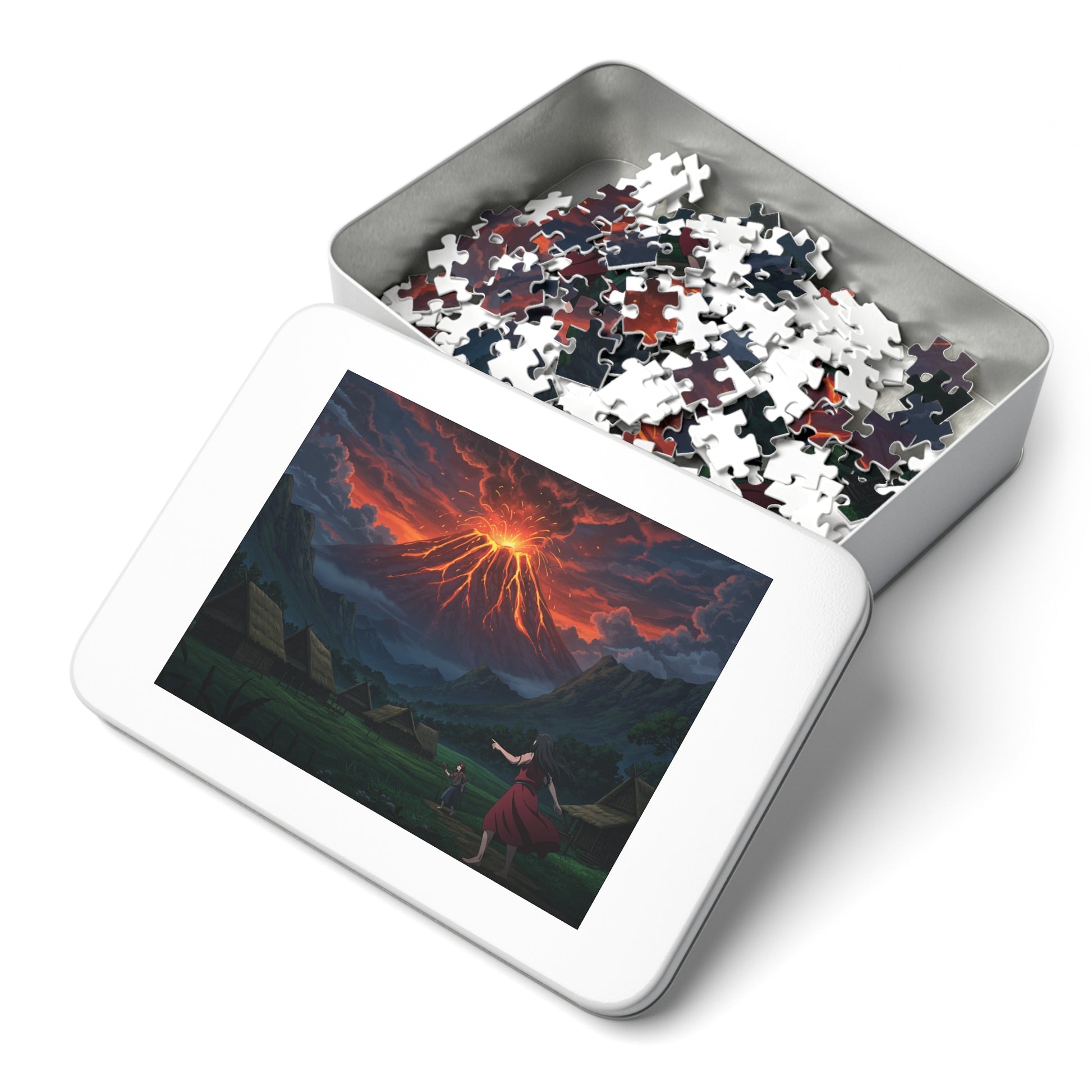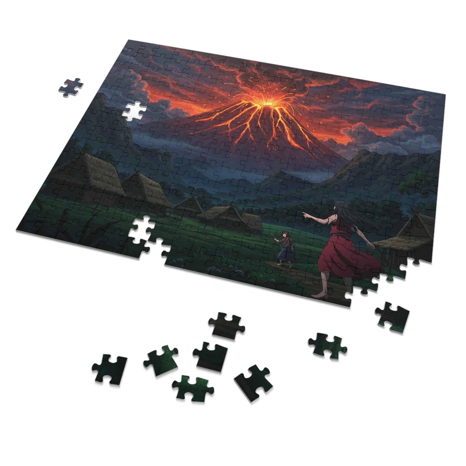🏔️ The detailed artwork showcases a small village at the base of the volcano, with villagers reacting in awe and fear as the eruption unfolds. Every piece reveals more of this striking contrast between human life and the overwhelming force of nature.