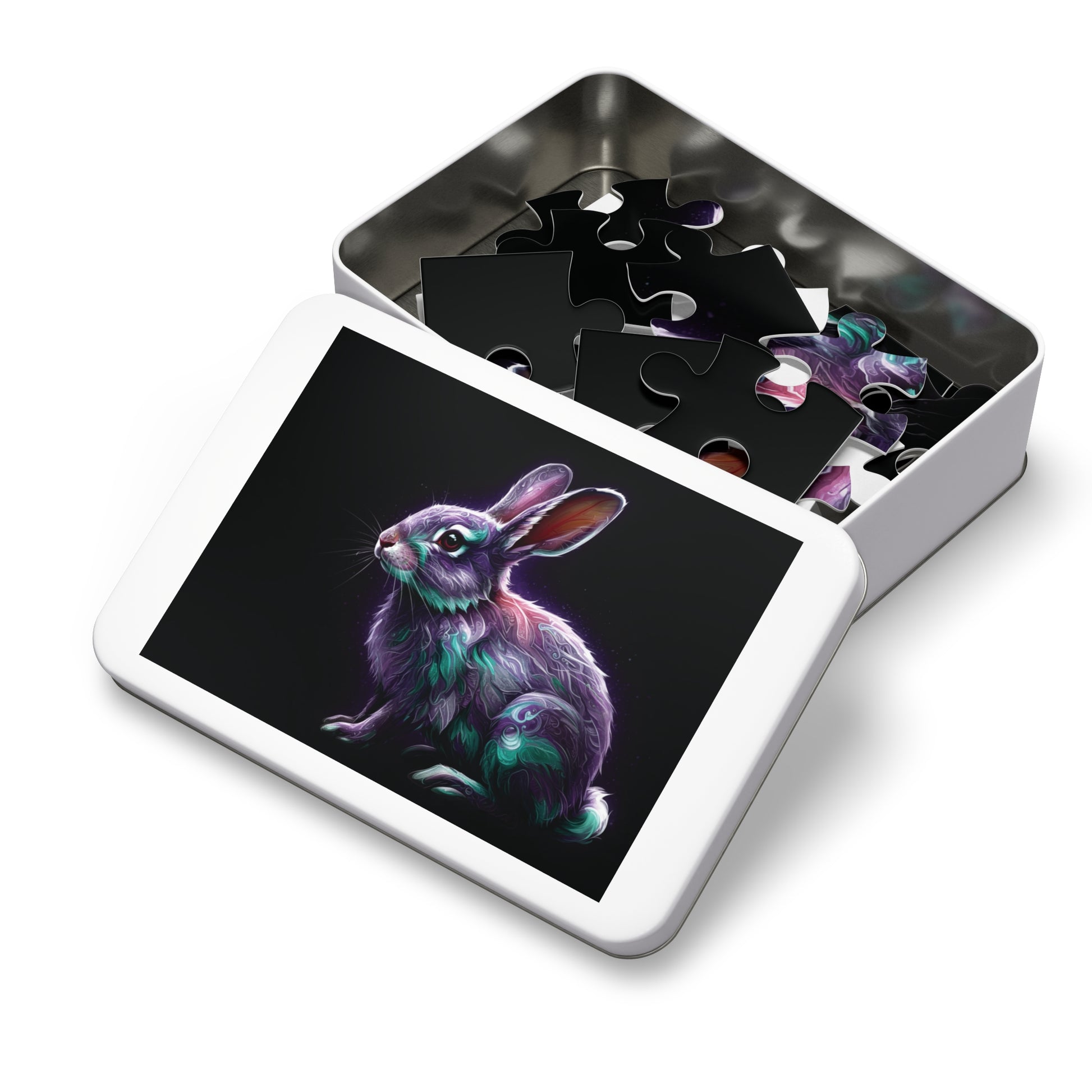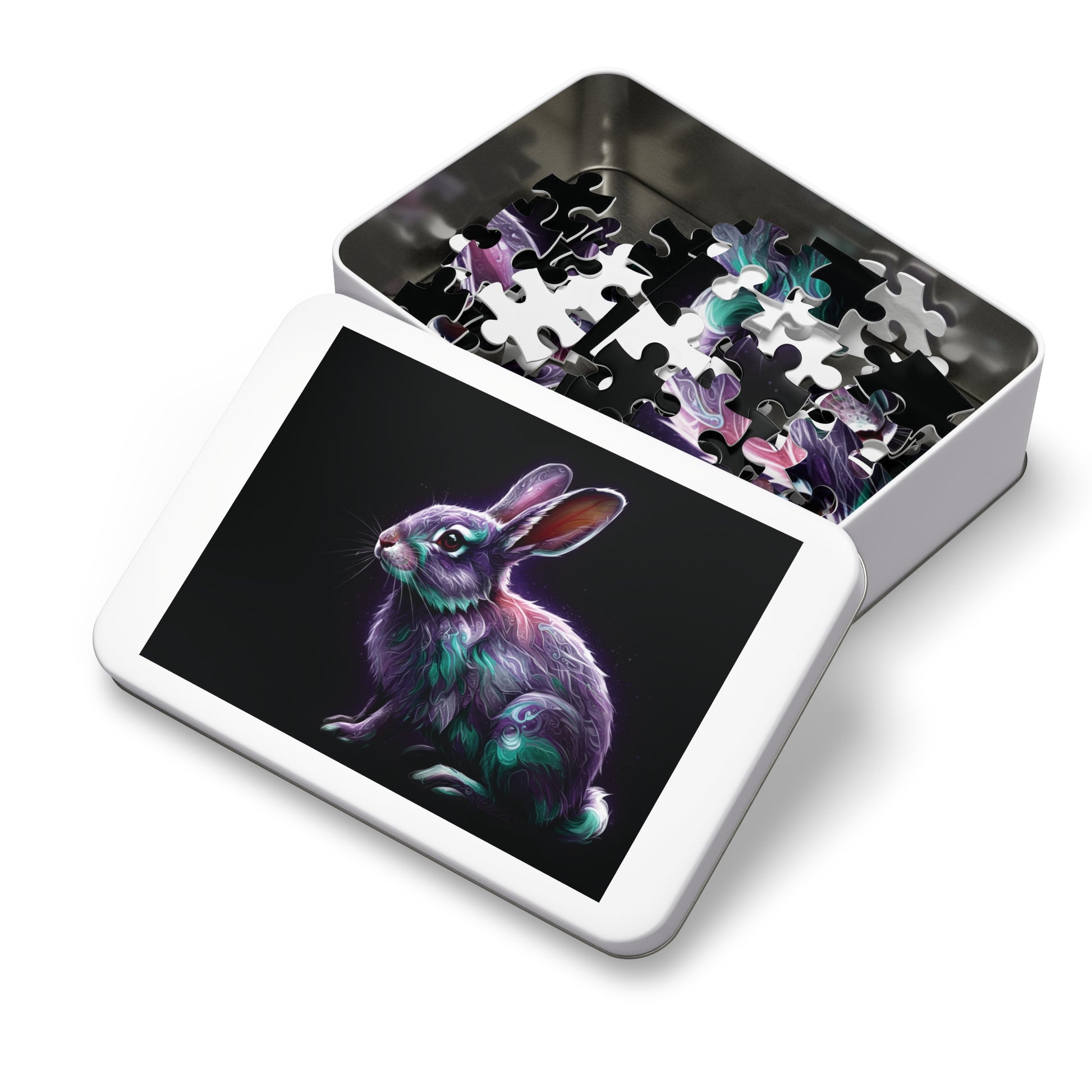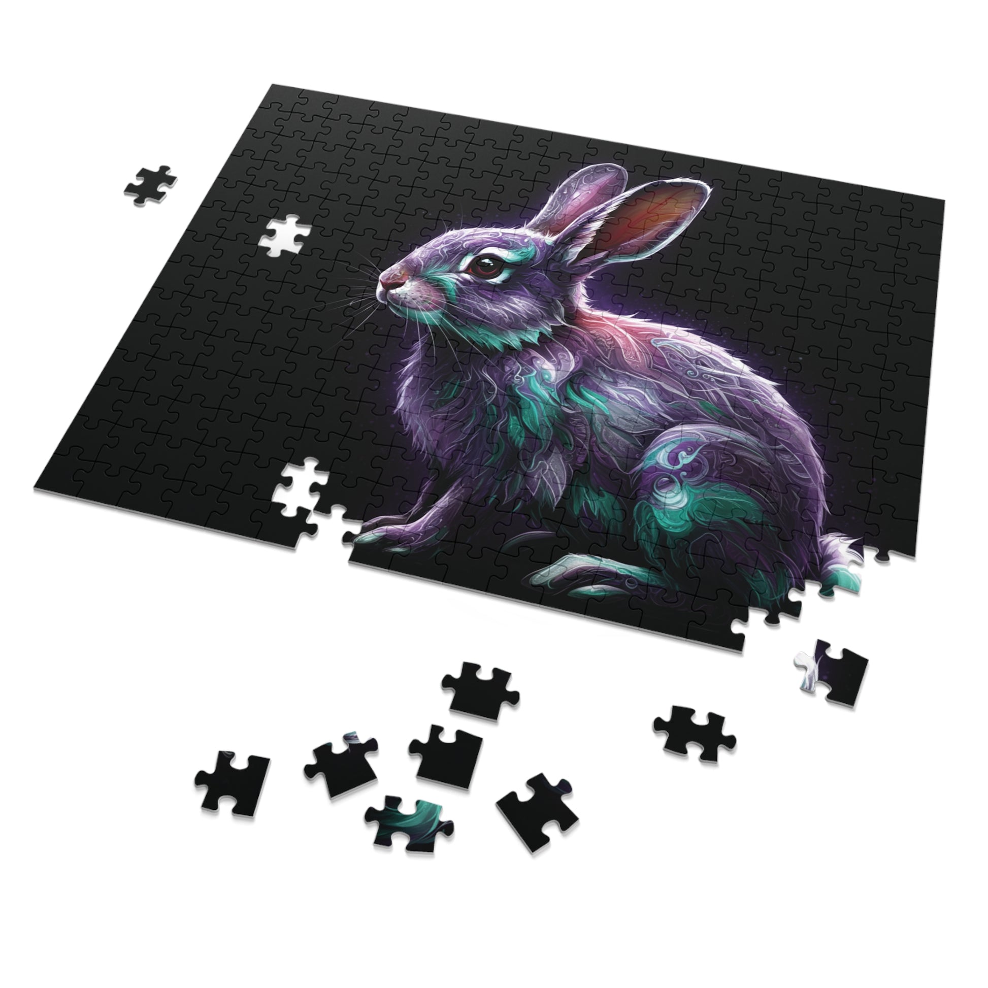 🌟 Step into a world of vibrant fantasy with this stunning jigsaw puzzle featuring a glowing, neon-inspired rabbit adorned with intricate patterns. The luminous purples, greens, and blues against a dark background create a mesmerizing contrast that brings this mystical creature to life.