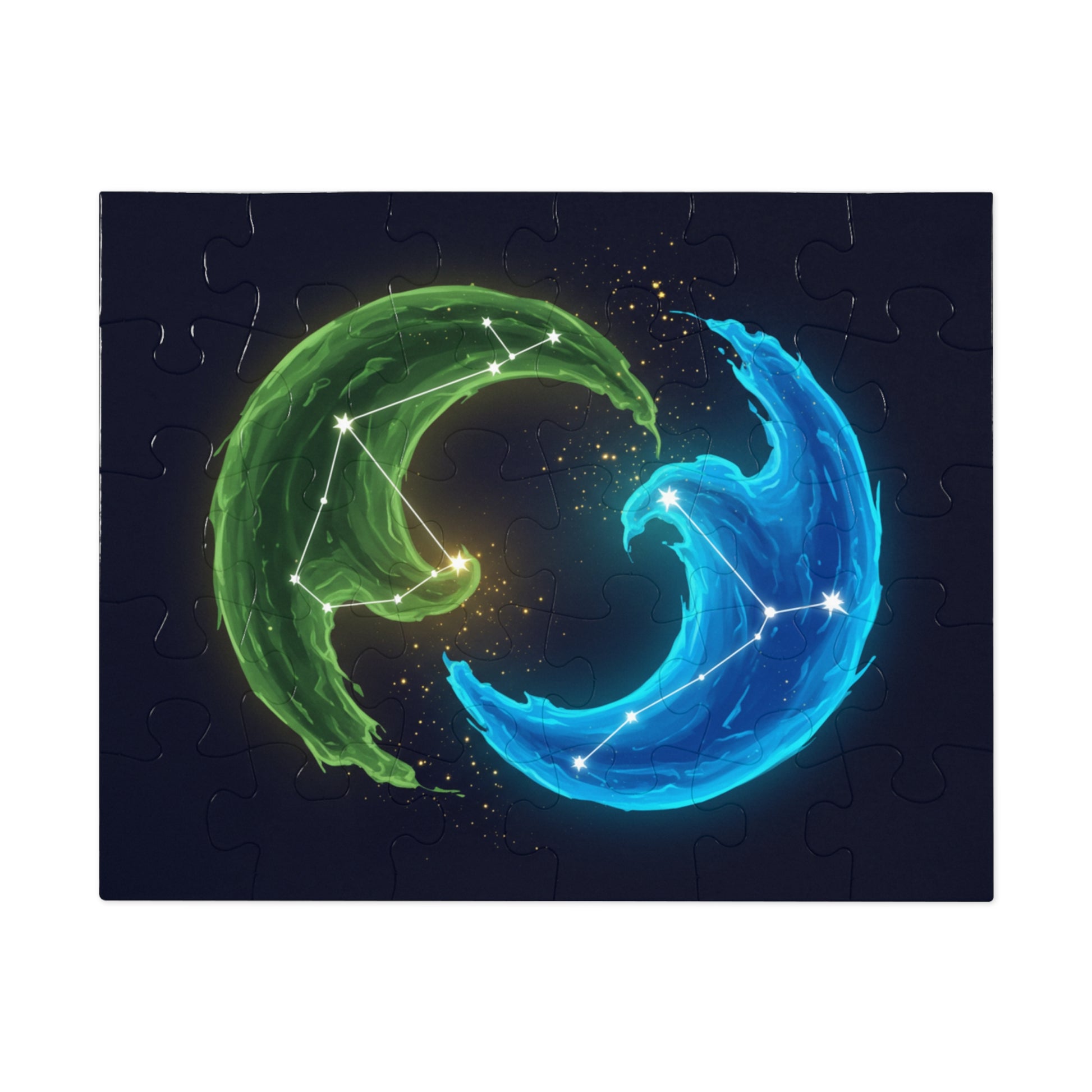 🌌 Explore the harmony of the cosmos with this mesmerizing jigsaw puzzle featuring two swirling elemental waves, one in vibrant green and the other in glowing blue. Each wave is adorned with bright constellations, symbolizing the perfect balance between forces of nature.