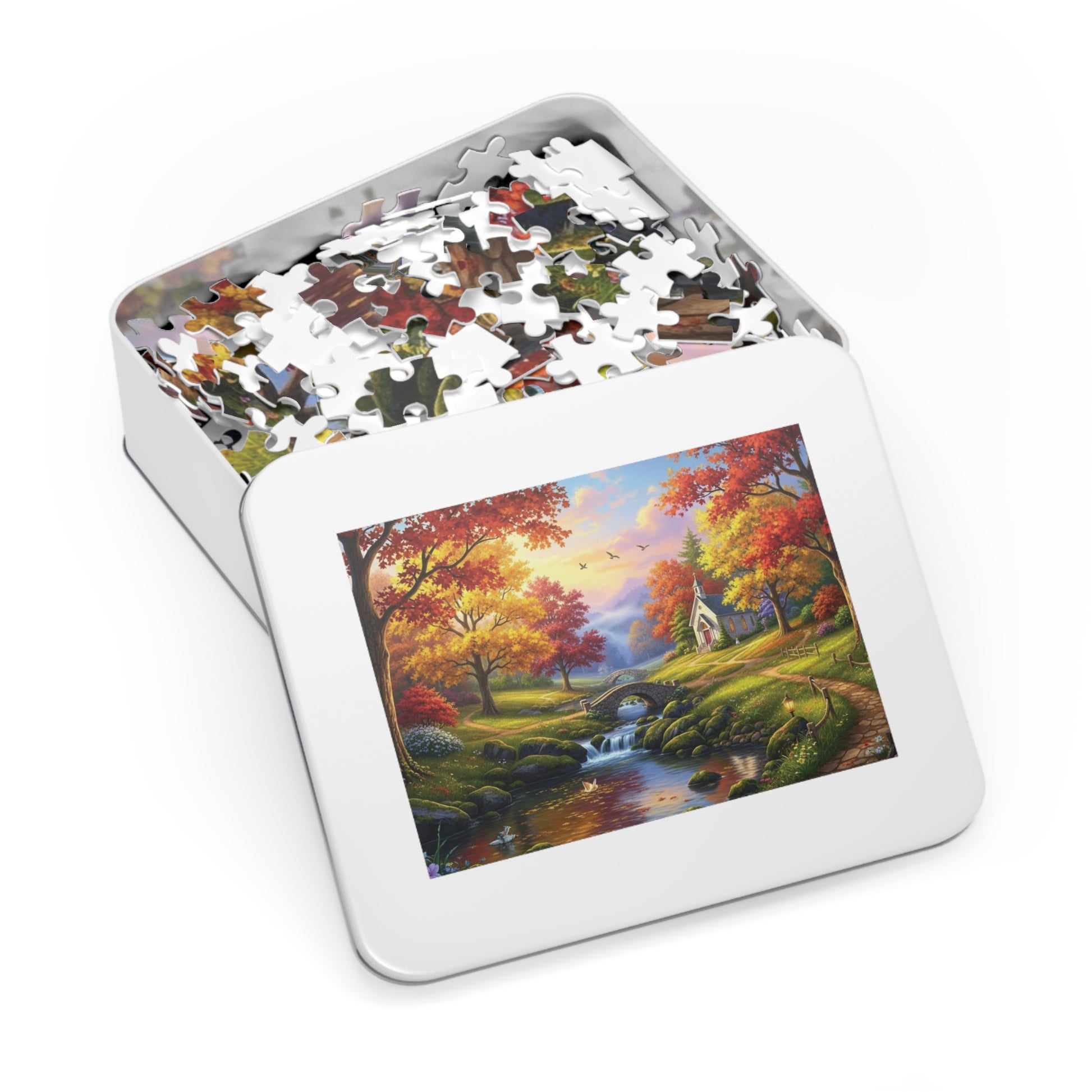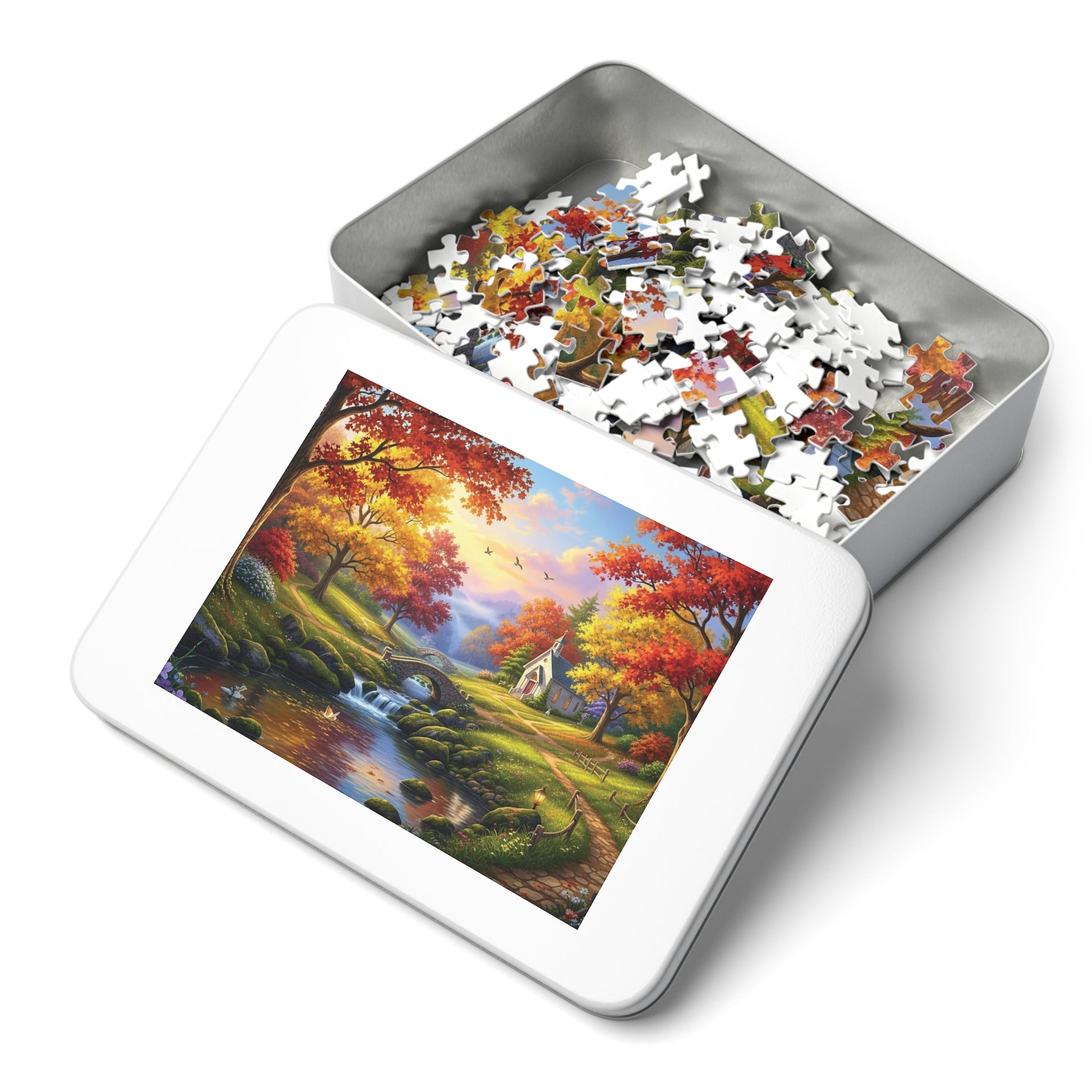 Step into a peaceful storybook world where golden autumn leaves glow beneath soft sunlight. This beautifully detailed puzzle features a charming white chapel nestled among vibrant maple and oak trees, a gentle stream flowing over mossy stones, and a graceful stone bridge leading the eye through the landscape. Warm fall colors, winding paths, and birds drifting across a pastel sky create a calming and immersive puzzle experience 🌿✨