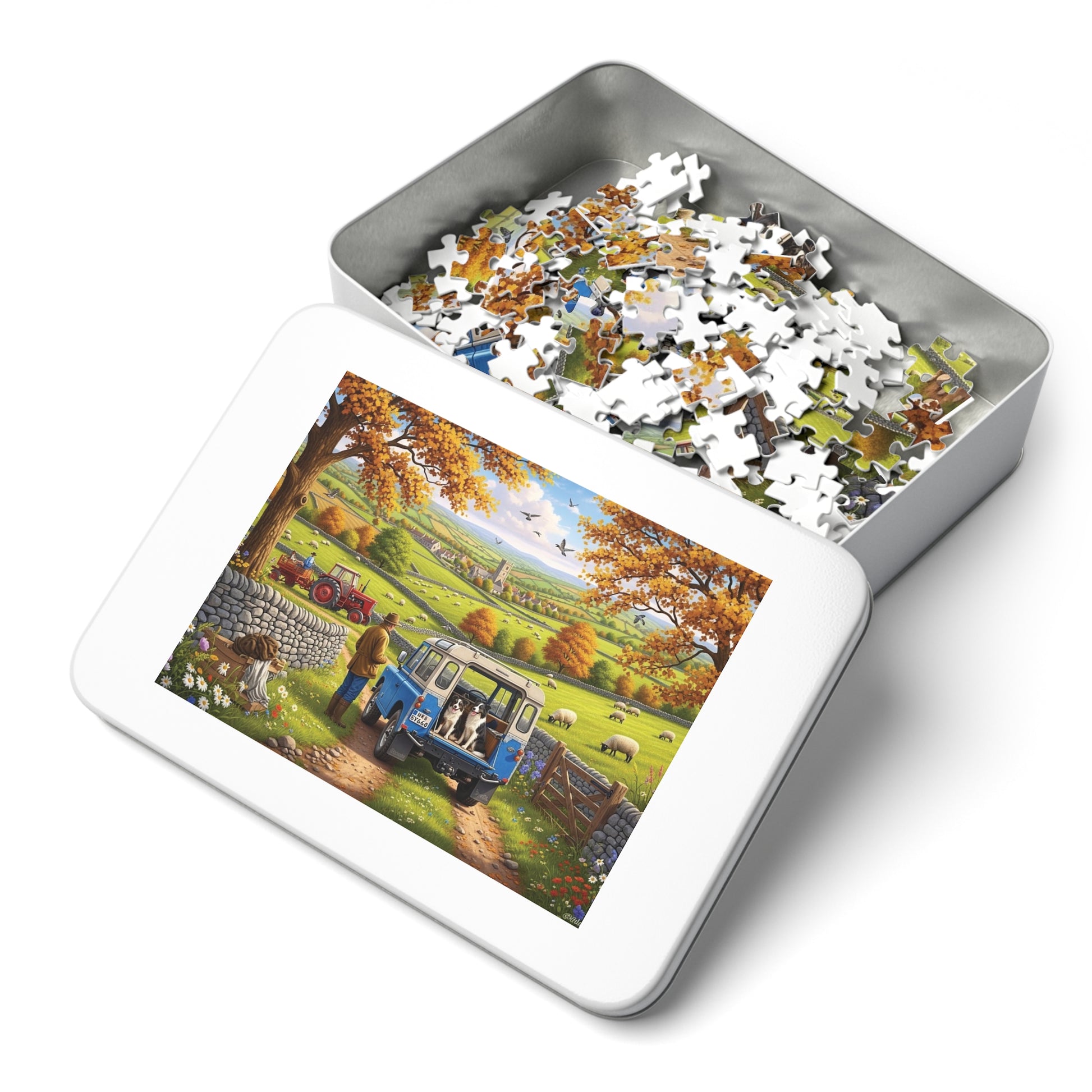 Bring warmth, calm, and nostalgia into your home with this beautifully illustrated countryside jigsaw puzzle. Featuring rolling green fields, grazing sheep, golden autumn trees, a red tractor at work, and loyal sheepdogs resting in the back of a classic Land Rover, this puzzle captures the charm of rural life in the English countryside.