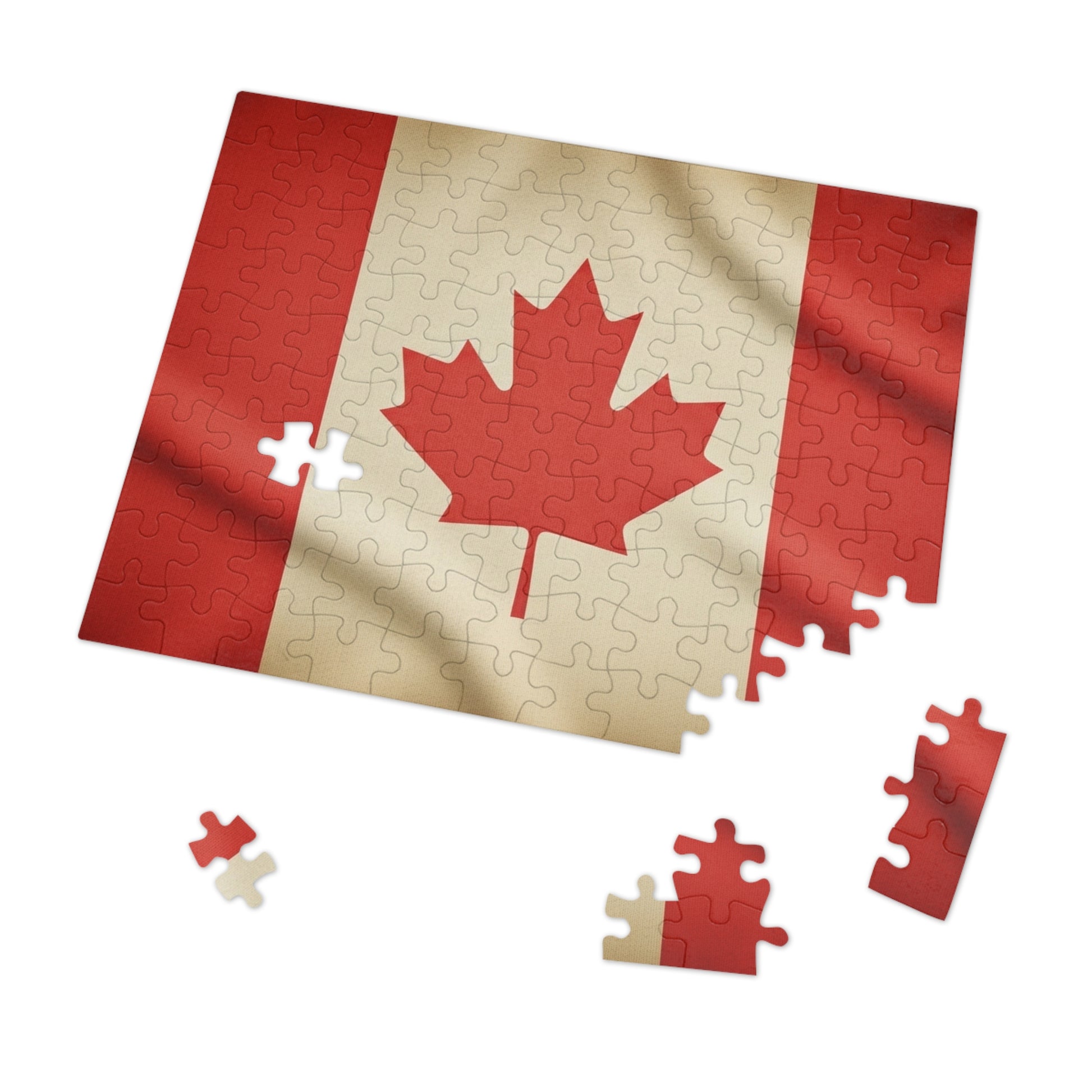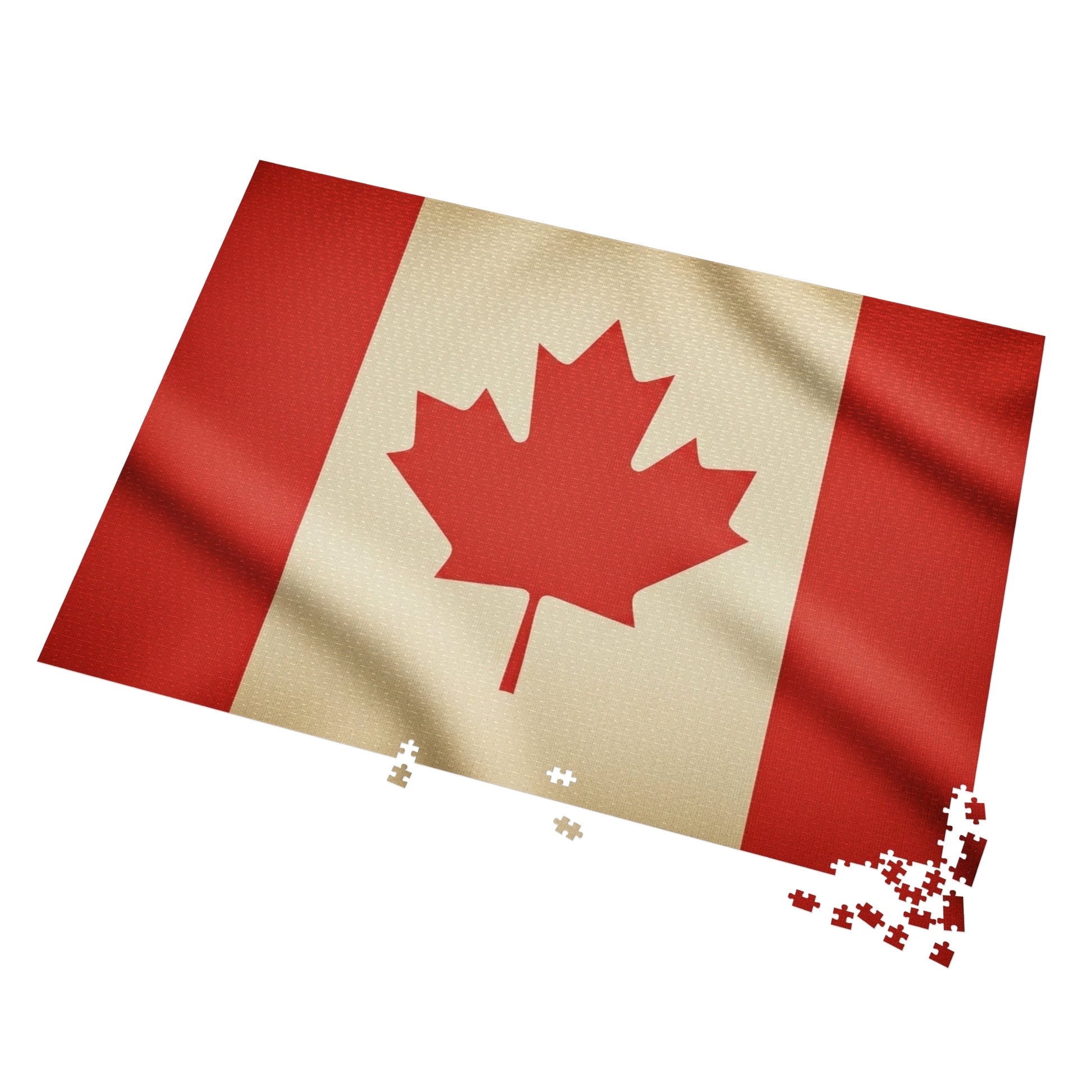 Celebrate the strength and symbolism of Canada with this bold jigsaw puzzle featuring the iconic red maple leaf set against a clean white field, framed by vibrant red side panels. The design is enhanced with subtle fabric texture and natural folds, giving the flag depth, movement, and a refined finish.