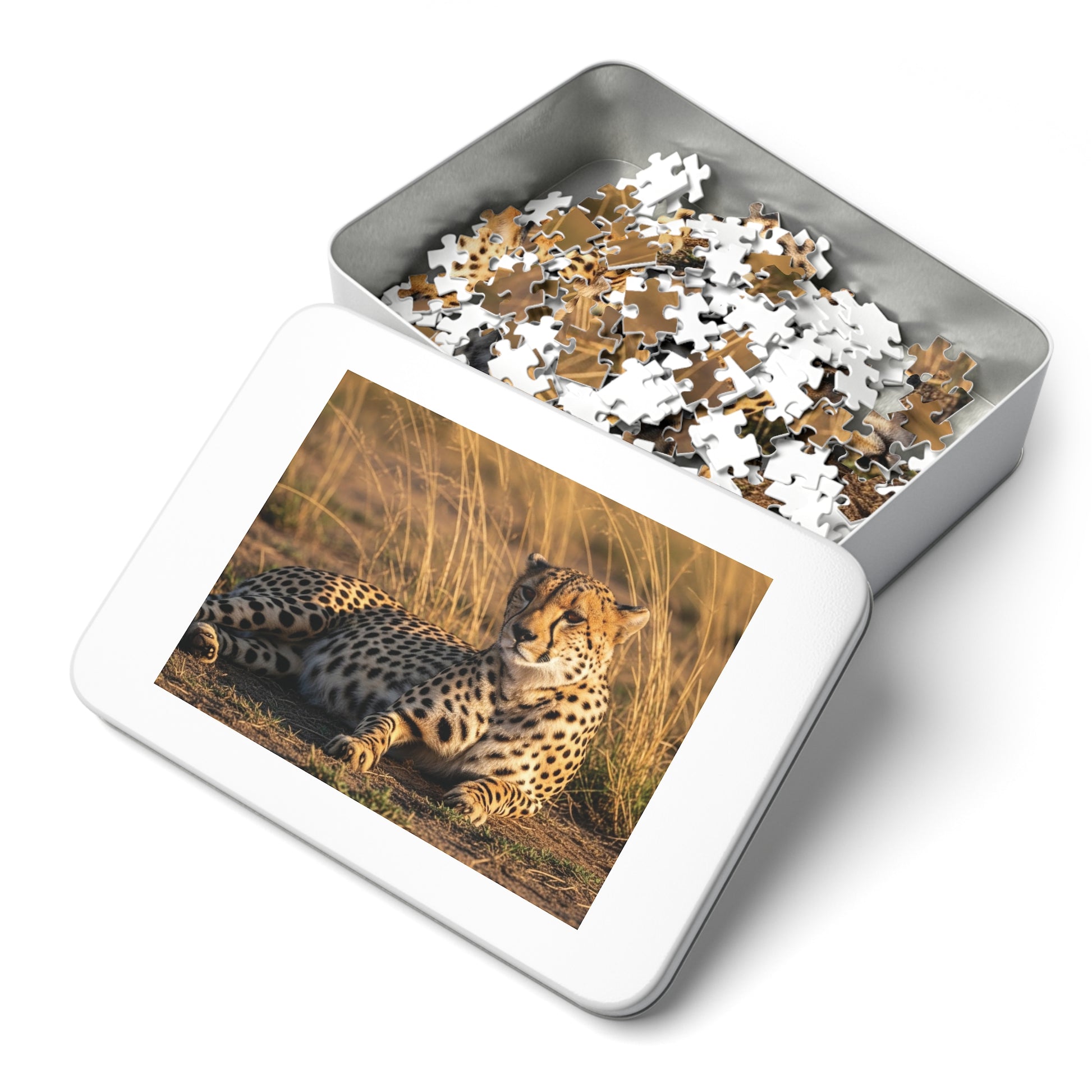 This captivating jigsaw puzzle features a majestic cheetah resting peacefully on open savannah ground, surrounded by tall golden grasses and warm natural light. The cheetah’s beautifully spotted coat and relaxed yet alert expression capture a moment of stillness from one of nature’s fastest animals. The scene blends power, grace, and tranquility into a visually soothing puzzle experience.