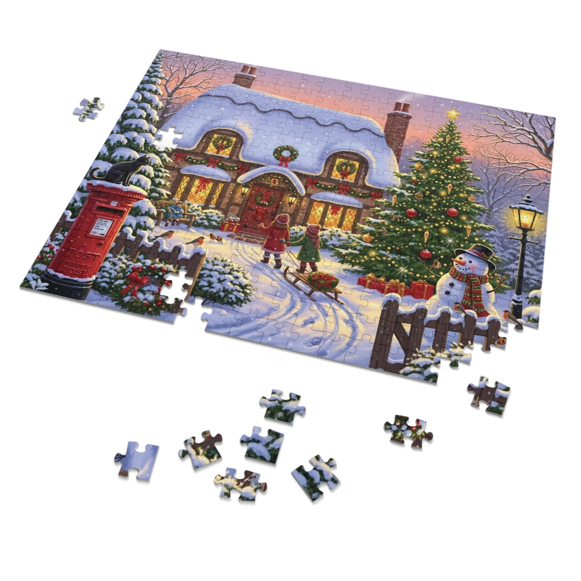 Christmas Cottage Jigsaw Puzzle with Tree Snowman and Sled