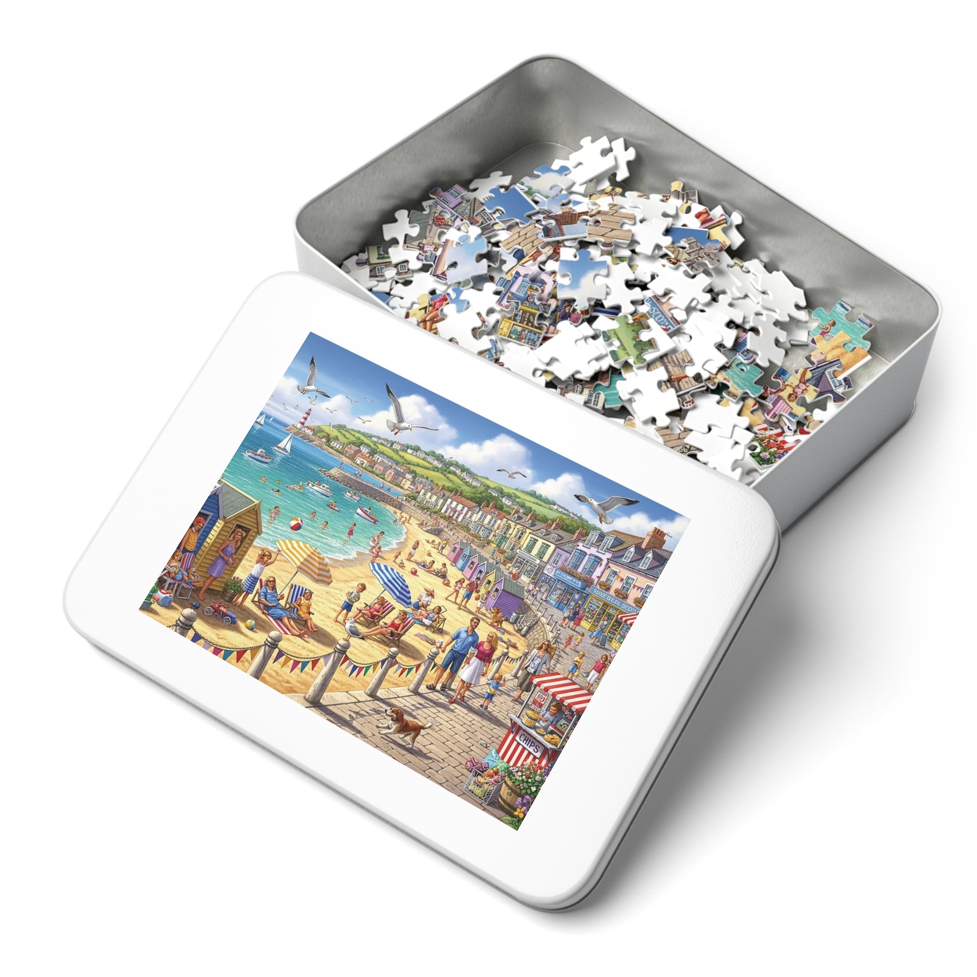 This beautifully illustrated jigsaw puzzle captures a bustling summer day by the British coast. Families relax on golden sand beneath striped umbrellas, children play by the water, and swimmers enjoy the sea while sailboats drift across sparkling blue waves. Seagulls glide overhead, colourful beach huts line the shore, and a lively promenade is filled with shops, cafés, bunting, and cheerful holidaymakers.