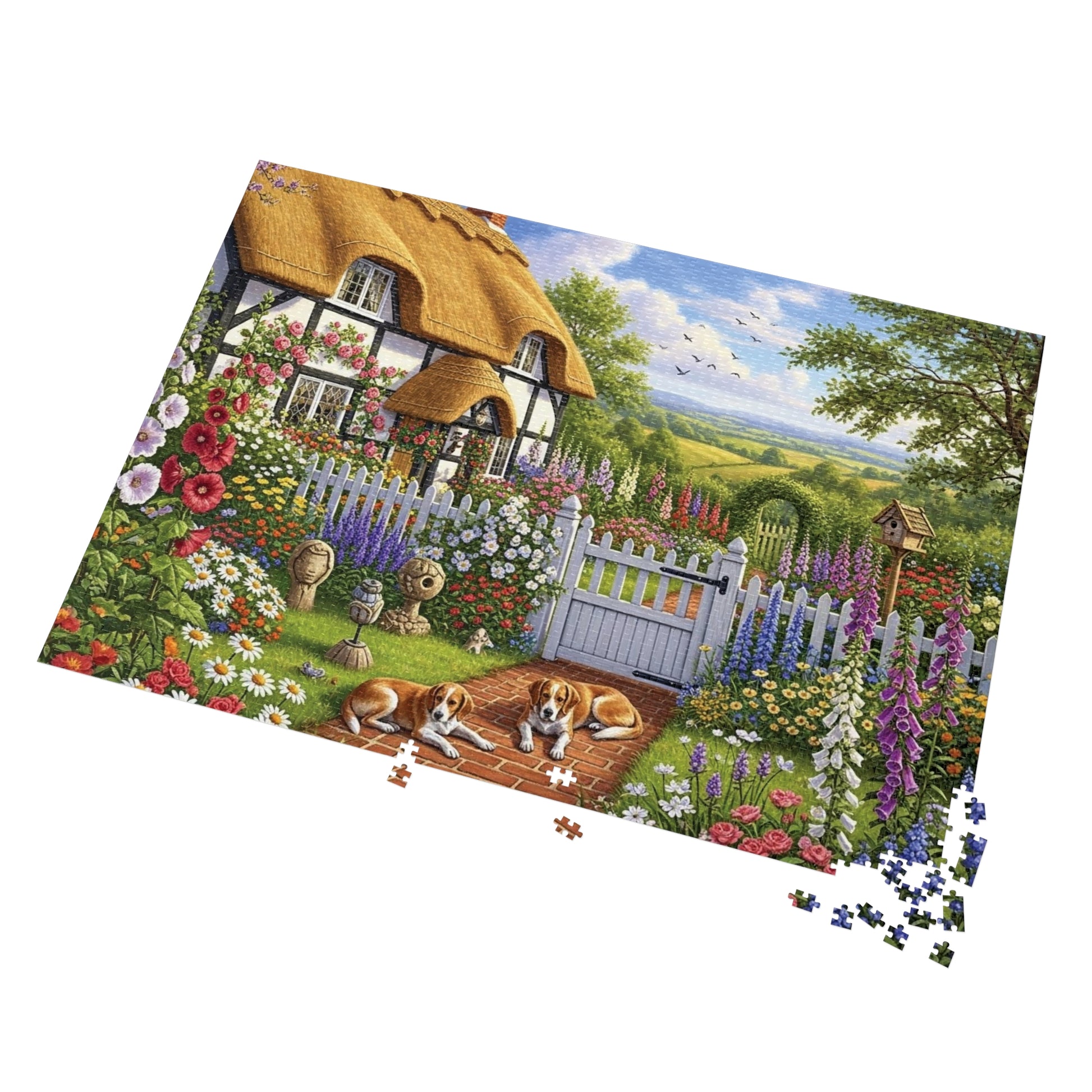 This beautifully illustrated jigsaw puzzle captures the timeless charm of a traditional thatched cottage surrounded by blooming flowers, lush greenery, and a welcoming garden path. A white picket fence frames the scene, with climbing roses, hollyhocks, and cottage blooms spilling over into the lawn. Two loyal dogs rest along the brick walkway, adding warmth and life to this serene countryside moment.