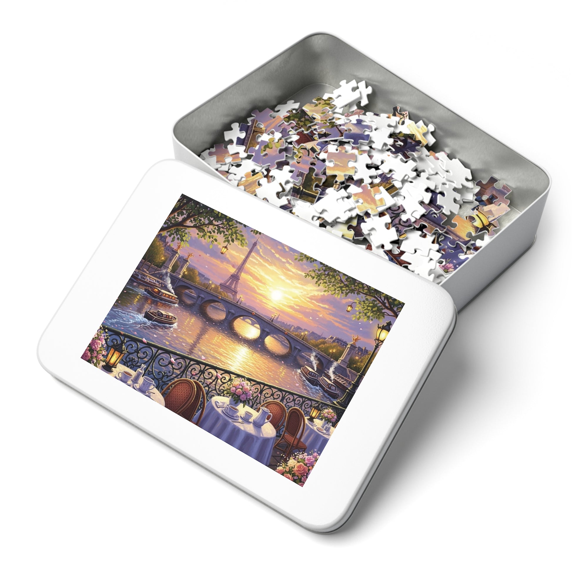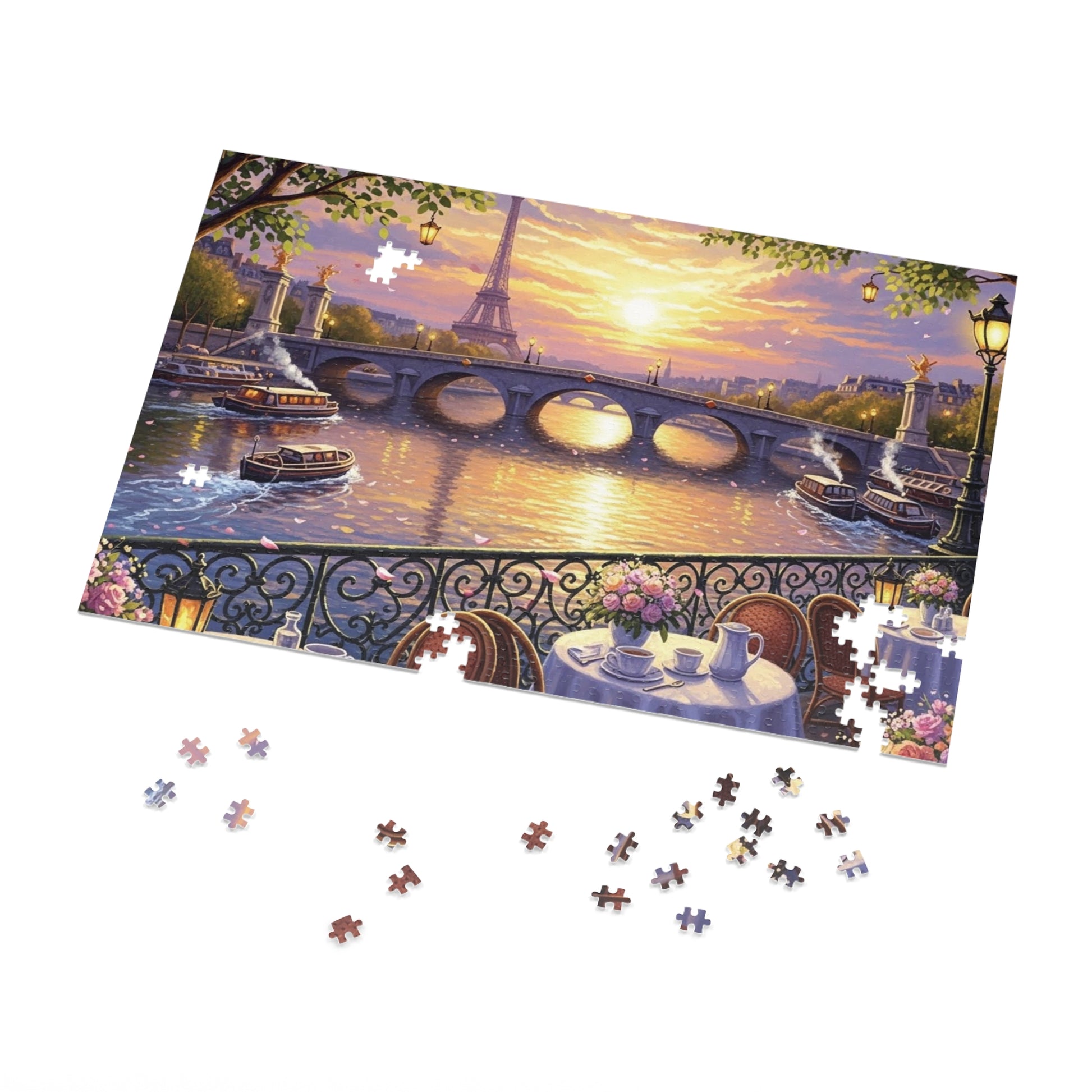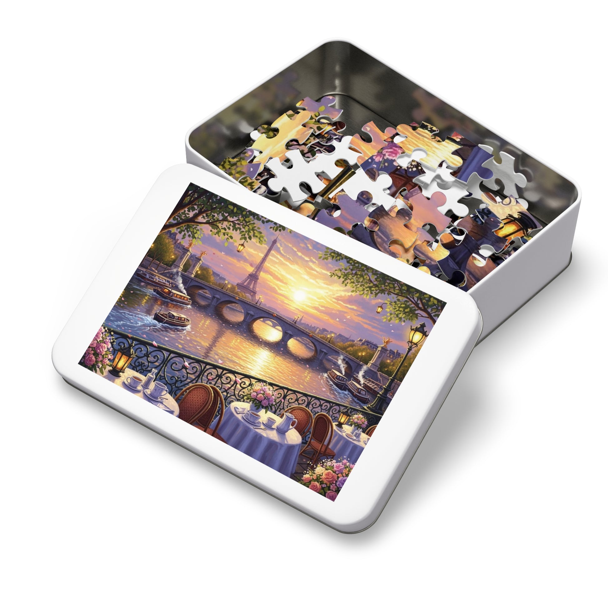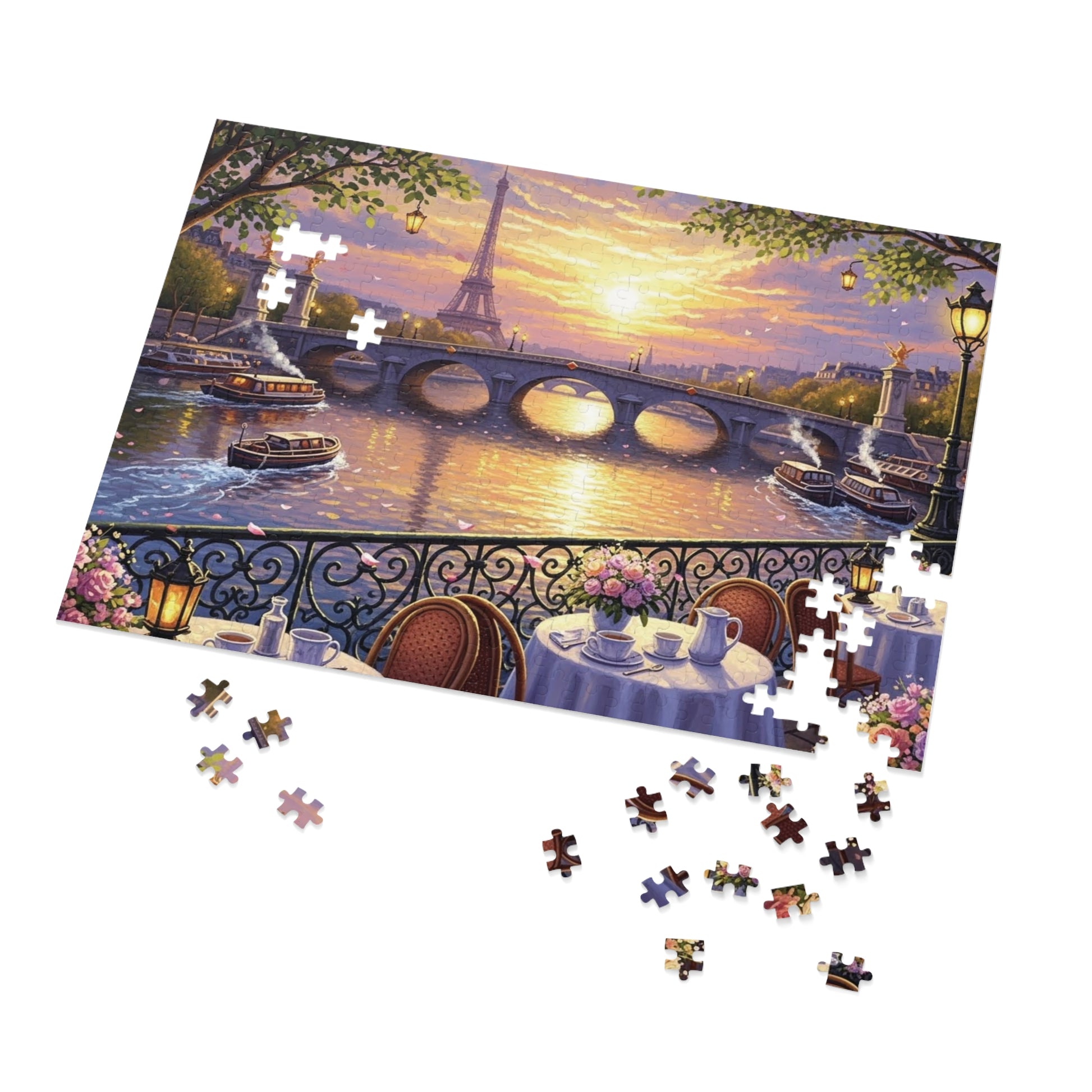 Eiffel Tower Sunset Over the Seine Puzzle | Paris Café Terrace Artwork