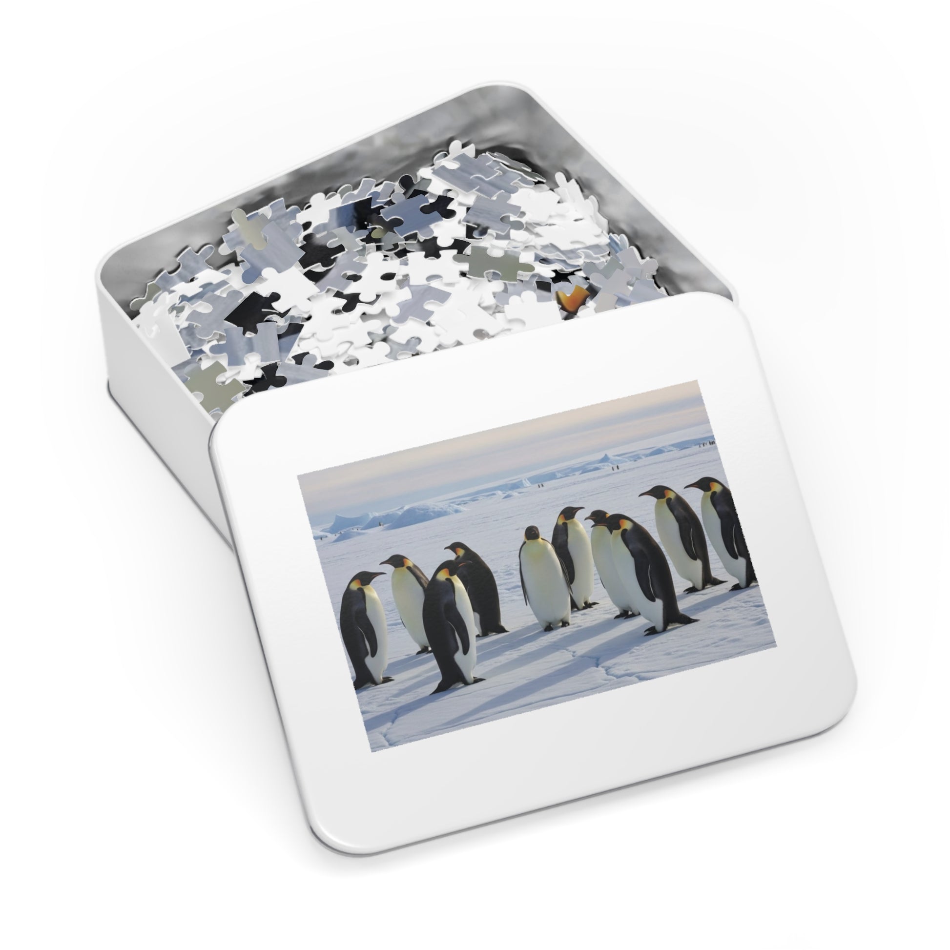 Step into a quiet polar world where majestic emperor penguins gather on vast icy terrain. This captivating jigsaw puzzle showcases a peaceful moment in the Antarctic, with smooth snow fields, distant ice formations, and a group of penguins standing together under soft natural light. The scene is tranquil, minimal, and visually soothing, making it perfect for mindful puzzle time.