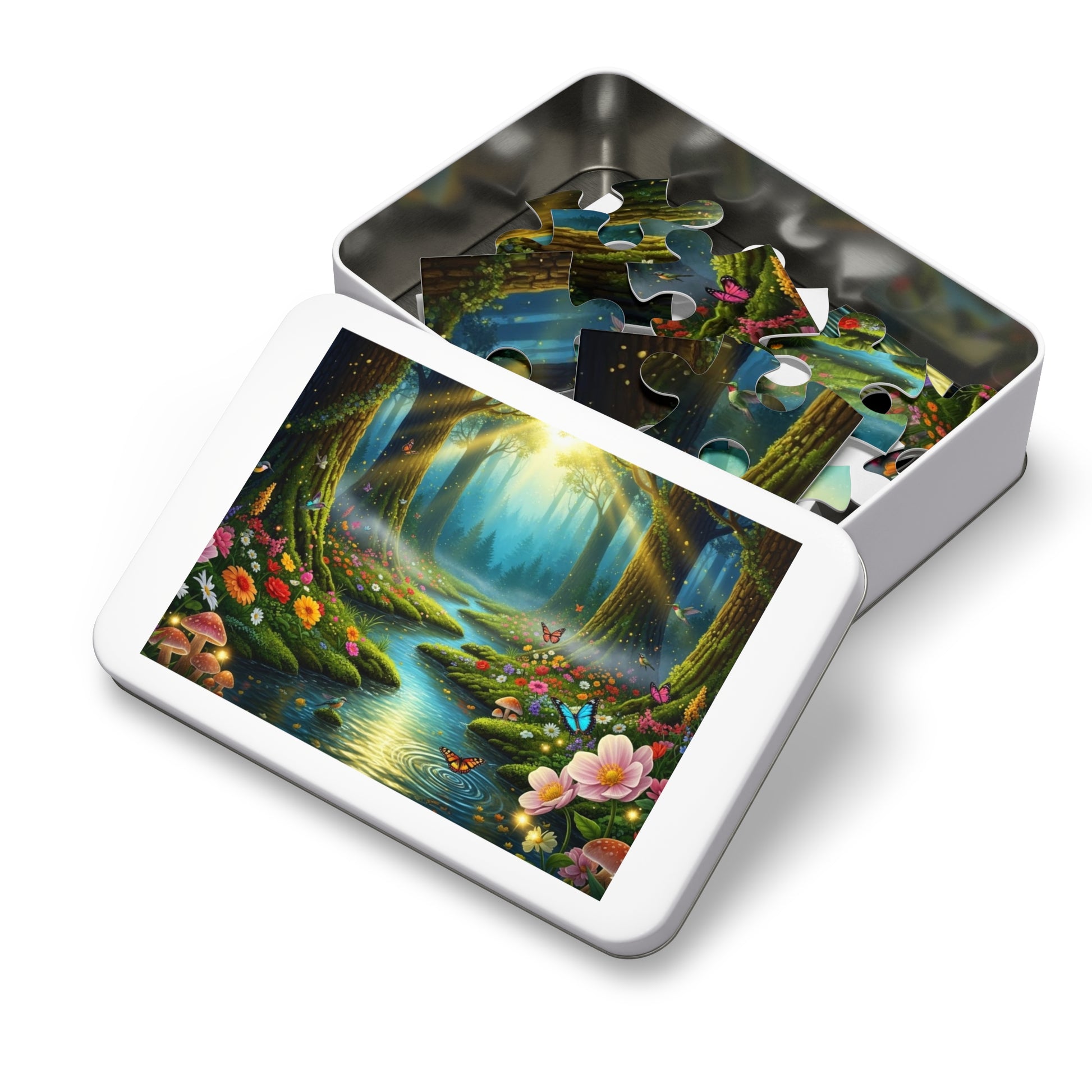 ✨ Wander into a luminous woodland where golden sunlight pours through towering trees and a gentle stream winds its way through a carpet of blooming wildflowers. This breathtaking jigsaw puzzle captures a magical forest moment filled with fluttering butterflies, tiny birds, glowing firefly lights, and colorful mushrooms nestled among soft green moss.