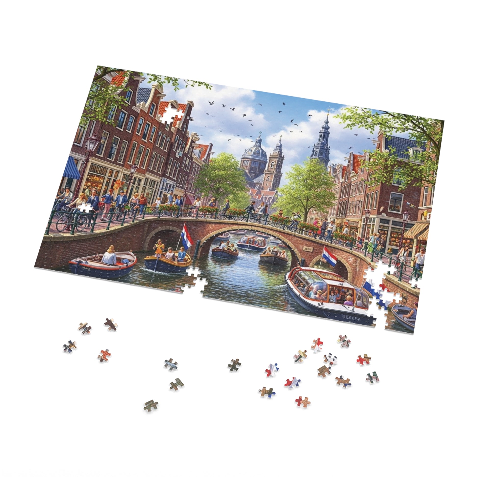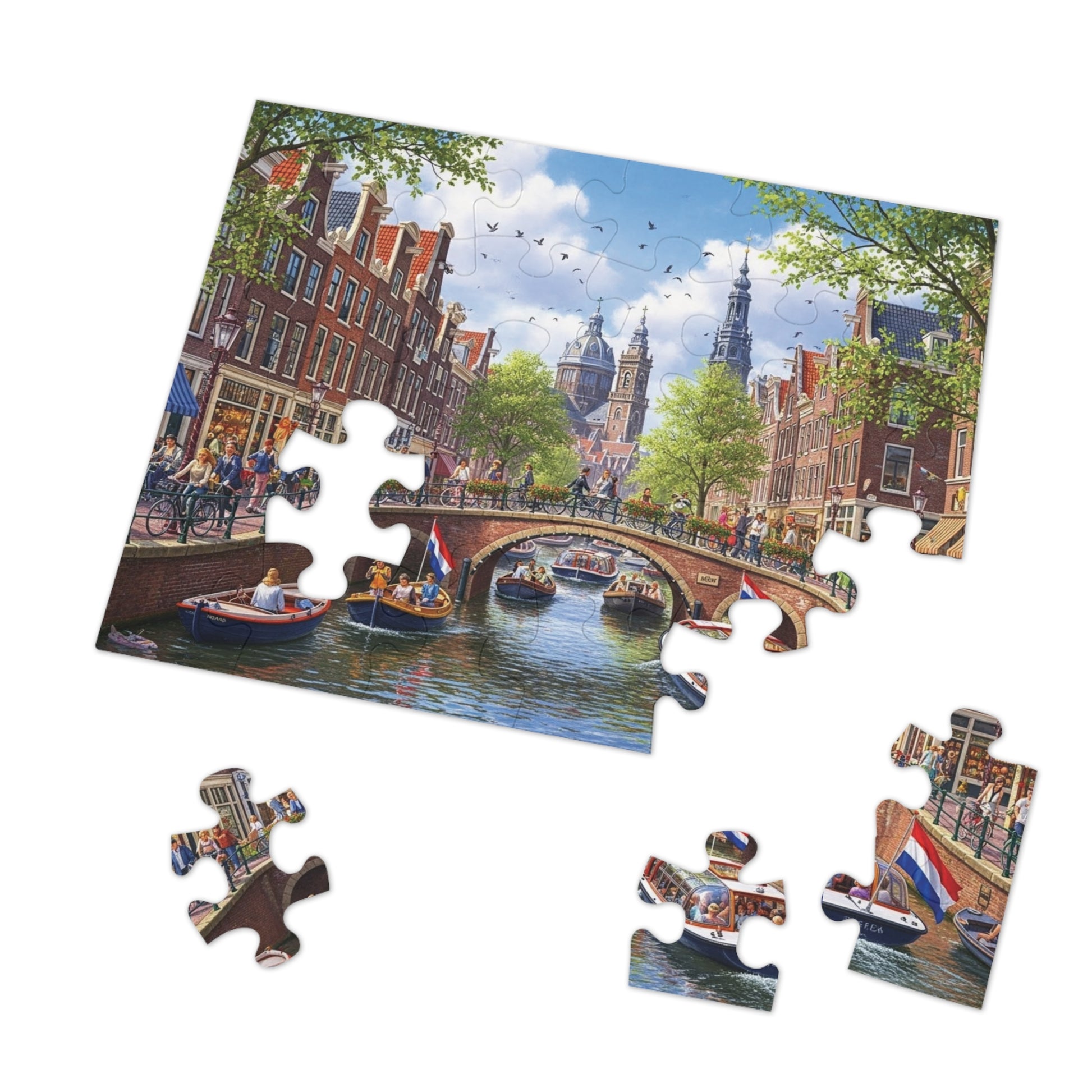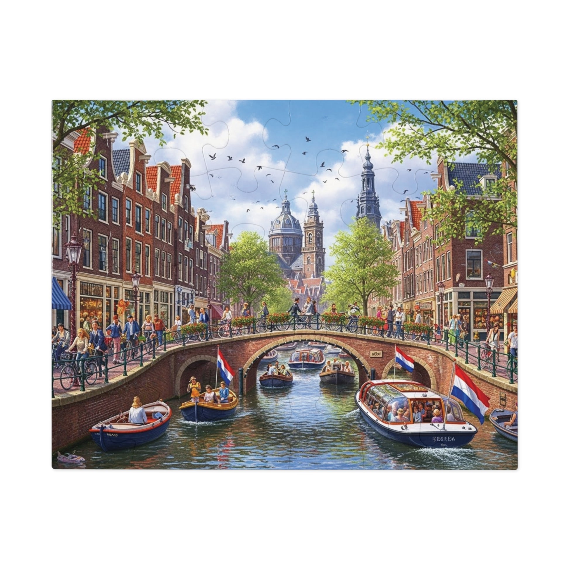 This beautifully illustrated jigsaw puzzle captures a vibrant day along a classic Amsterdam style canal. Elegant brick buildings line the water, cyclists and pedestrians cross a flower-filled bridge, and boats glide gently beneath. Dutch flags flutter in the breeze as historic church towers rise above the rooftops, creating a scene full of movement, culture, and charm.