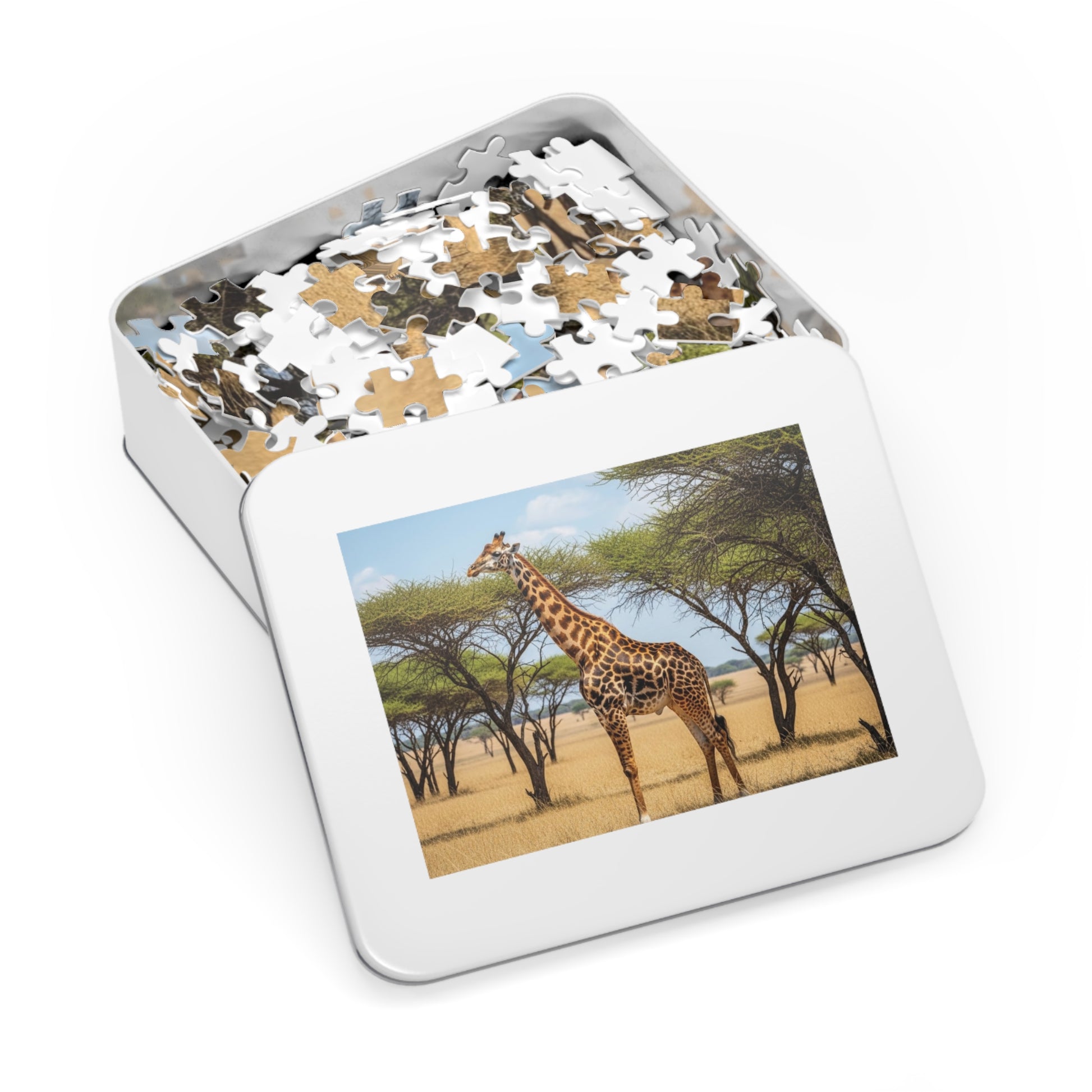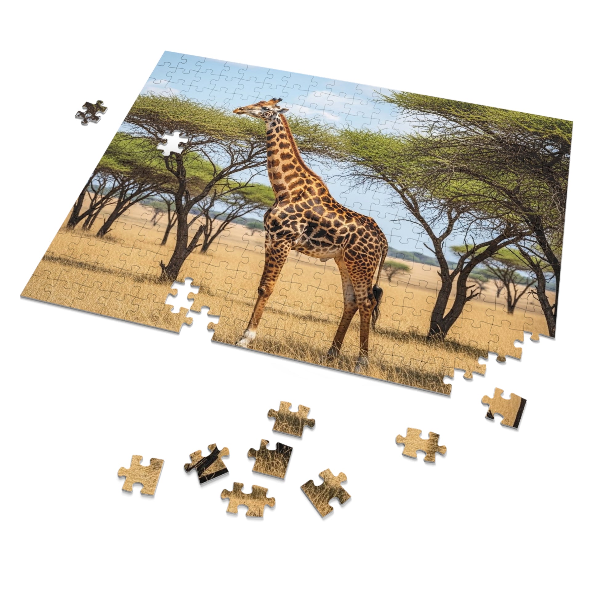 This beautiful jigsaw puzzle captures a graceful giraffe standing tall among scattered acacia trees on the open savannah. Bathed in bright African daylight, the giraffe’s long neck and striking patterned coat stand out against golden grasslands and clear blue skies. The scene conveys calm, balance, and quiet strength, offering a peaceful connection to nature with every piece.