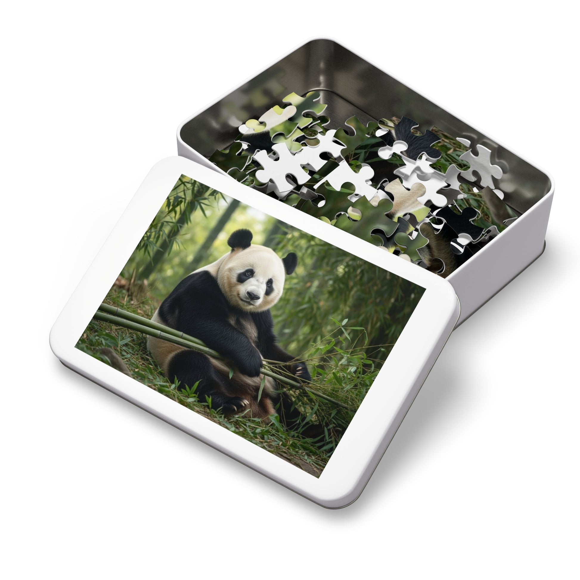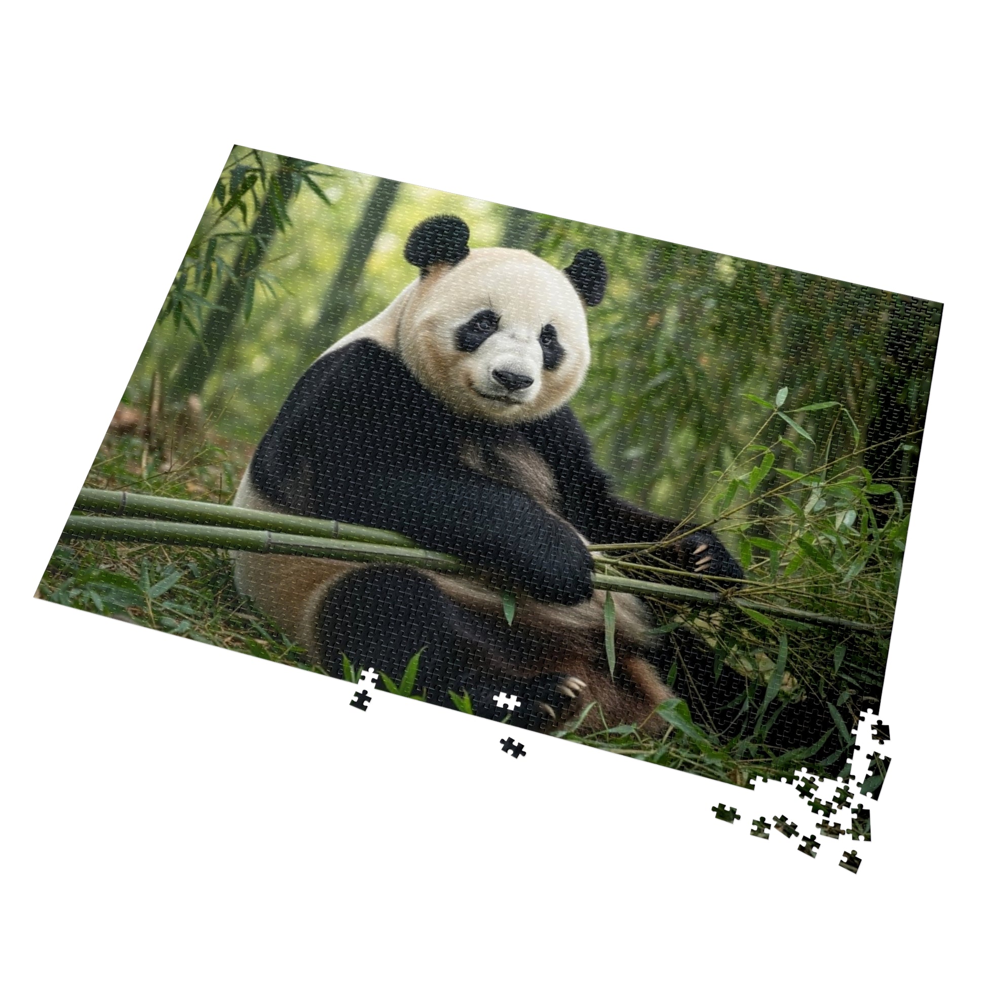 This beautifully balanced jigsaw puzzle features a giant panda resting peacefully while holding fresh bamboo, surrounded by soft green foliage and filtered forest light. The panda’s relaxed posture, expressive eyes, and contrasting black and white fur create a scene that feels nurturing, grounding, and quietly joyful. It is an image that invites patience, focus, and slow appreciation of nature’s softer rhythms.