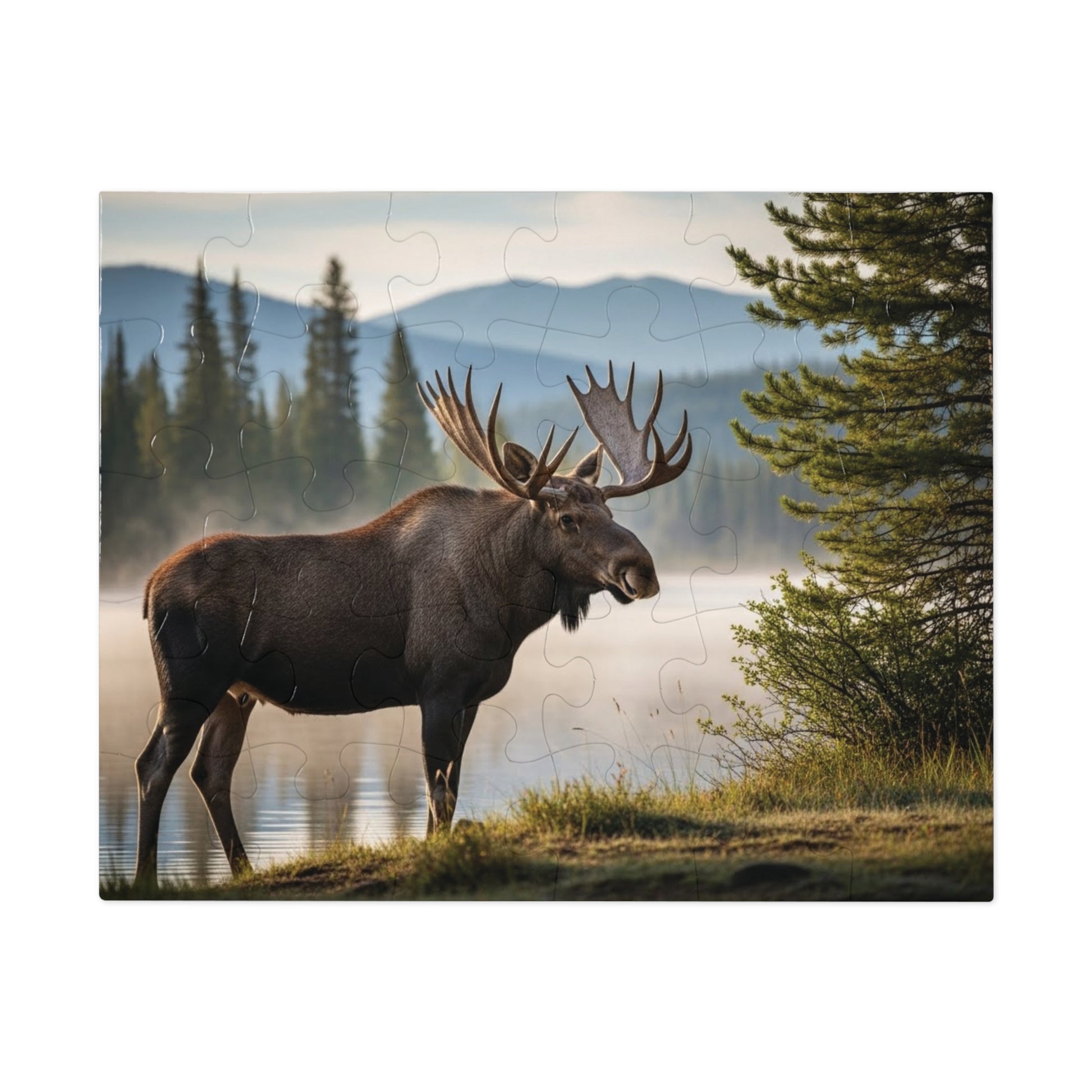 This stunning jigsaw puzzle captures a majestic moose standing peacefully beside a mist covered forest lake, framed by evergreen trees and distant mountains. The soft morning light, gentle fog, and powerful antlers create a scene of quiet strength, balance, and natural harmony. It is a moment of stillness that invites focus, patience, and mindful relaxation.