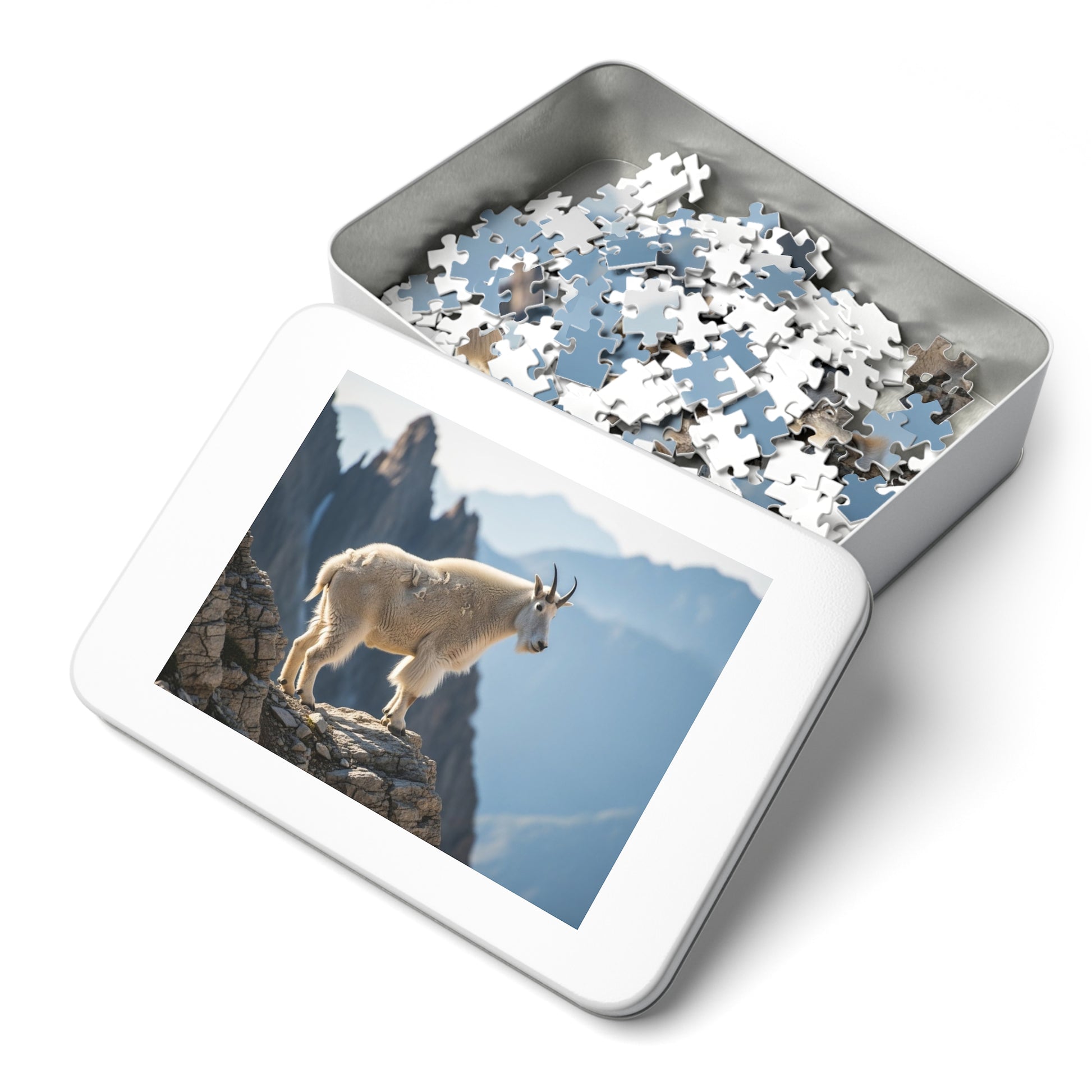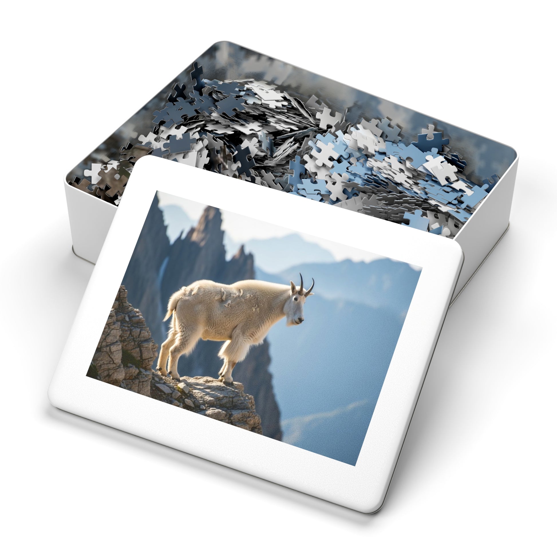 This ultra realistic wildlife puzzle features a full-body mountain goat standing confidently on a steep rocky ledge, surrounded by towering cliffs and distant misty peaks. Its thick white fur is richly textured, catching the cool alpine light as the dramatic landscape stretches into the distance. The composition captures strength, balance, and serenity in one breathtaking moment.