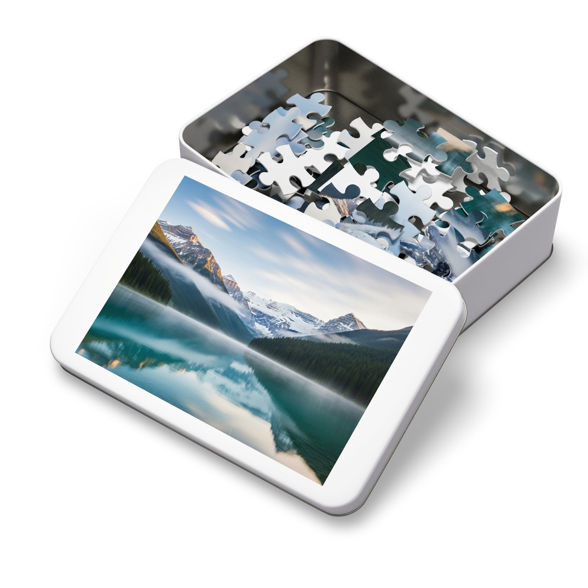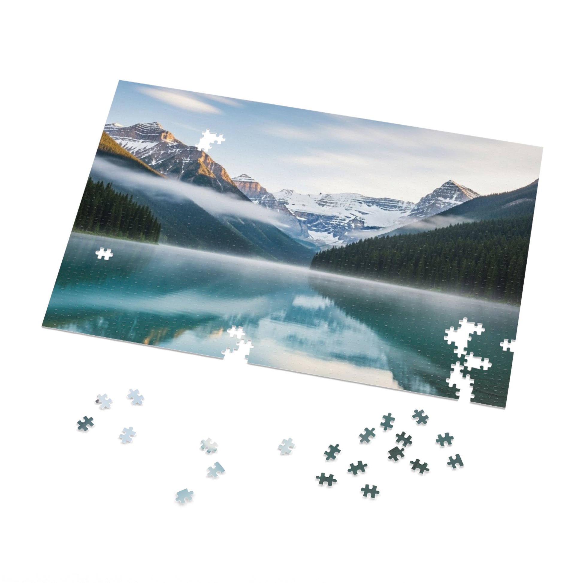 Soft morning mist drifts across crystal clear turquoise waters 🌫️💧, perfectly mirroring towering snow capped peaks 🏔️ and dense evergreen forests 🌲. The calm symmetry of the scene creates a deeply soothing and meditative experience, inviting stillness, focus, and awe with every piece placed.
