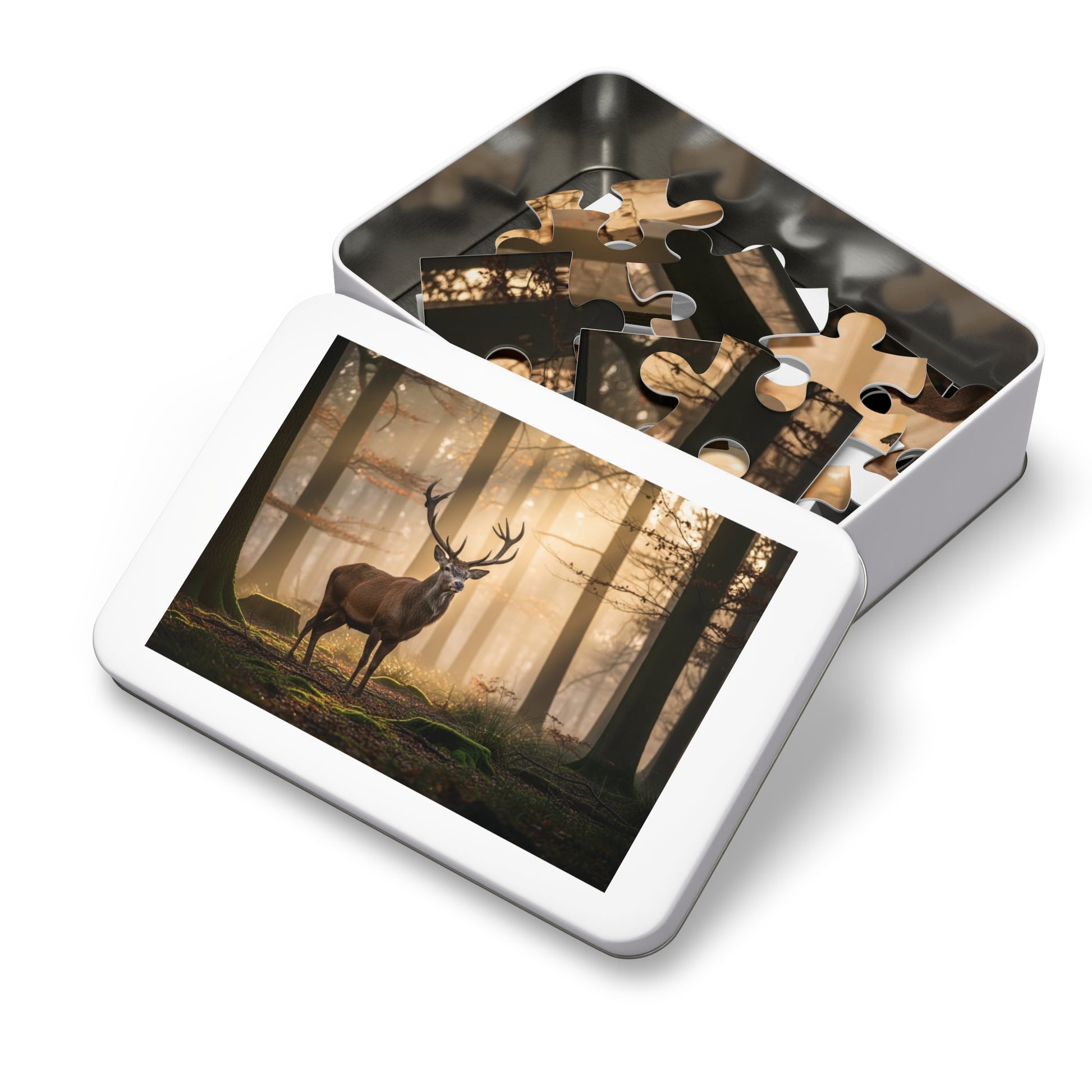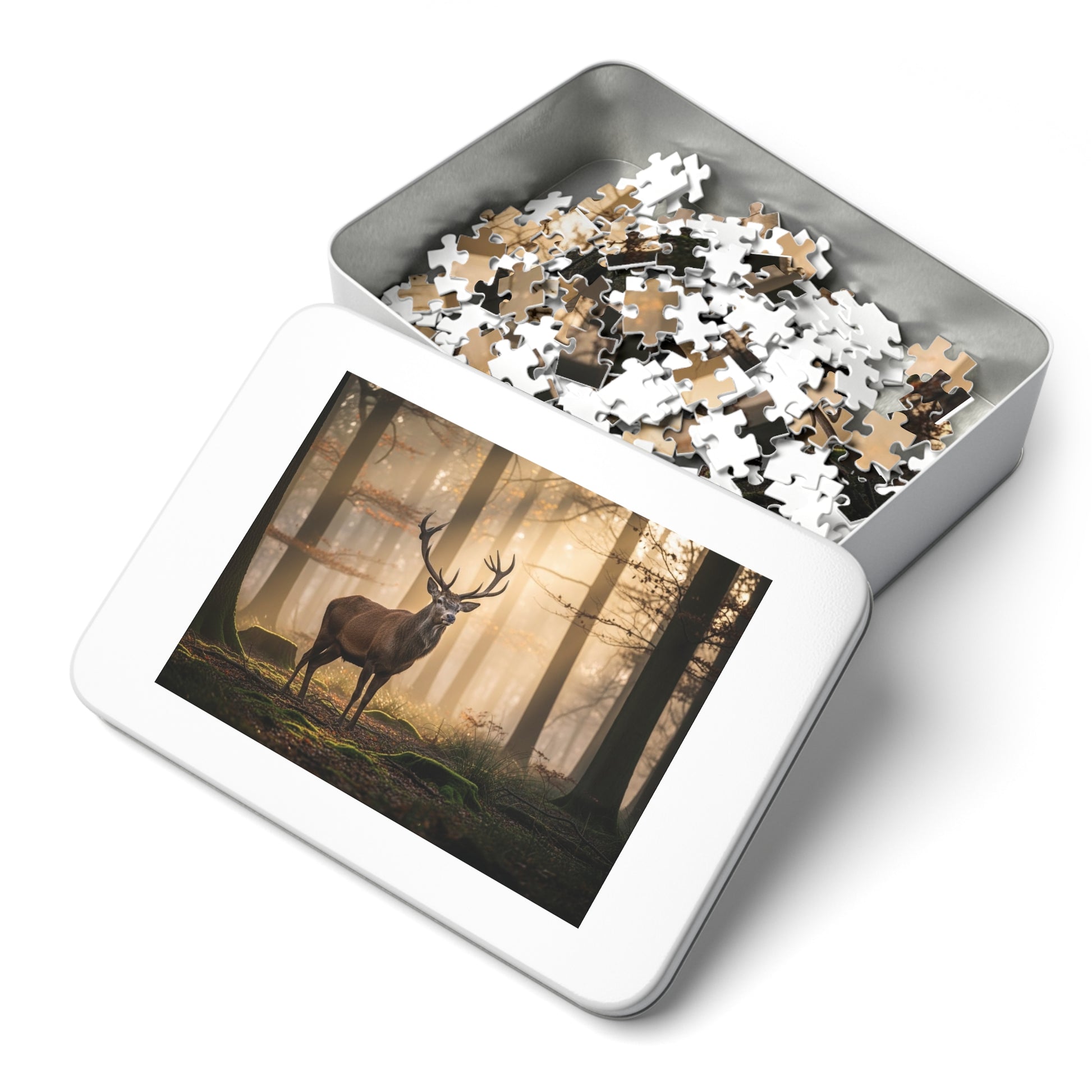 This stunning jigsaw puzzle captures a powerful stag standing proudly in a misty forest at dawn. Golden sunlight filters gently through tall trees, illuminating the stag’s impressive antlers and the moss covered forest floor. The atmosphere is calm, majestic, and deeply grounding, making this puzzle a perfect escape into nature.