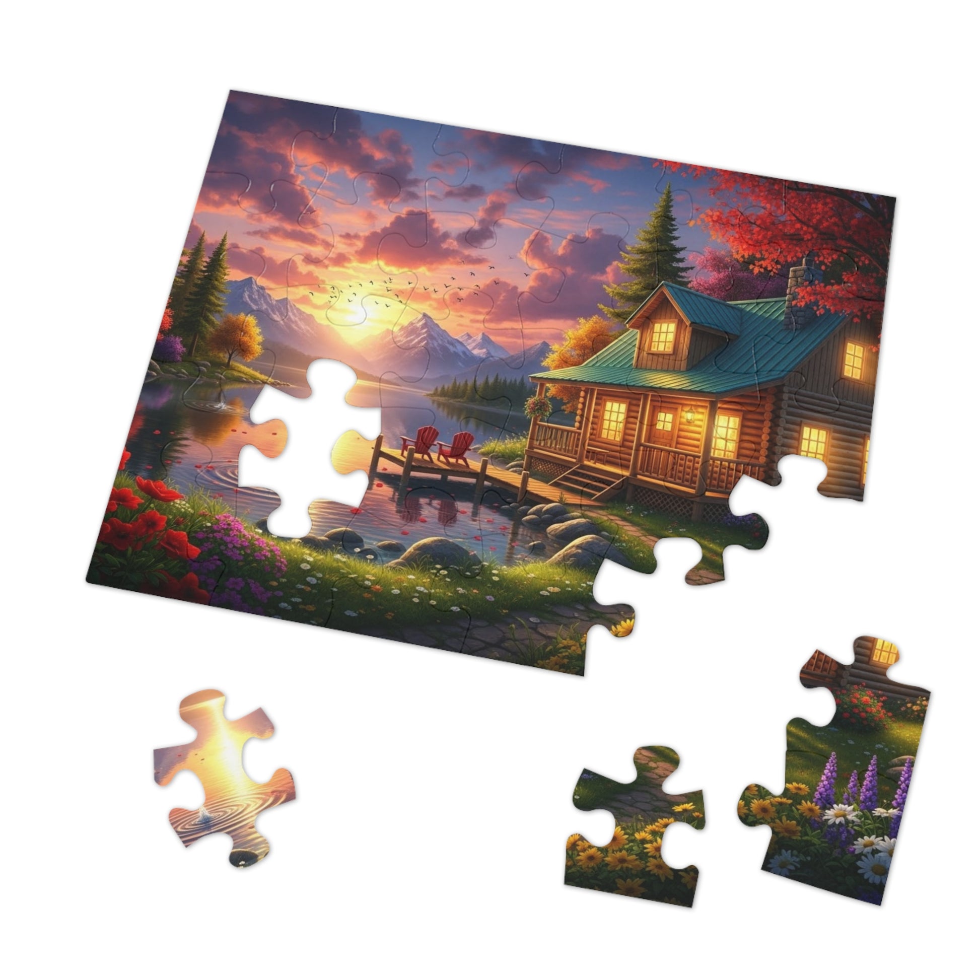 ✨ Step into a storybook wilderness where golden sunset light spills across a calm mountain lake and a warm log cabin glows with comfort and peace. This breathtaking jigsaw puzzle captures a cozy wooden home nestled among autumn trees, colorful wildflowers, and towering alpine peaks, with a quiet dock and red chairs inviting you to rest and take in the view.