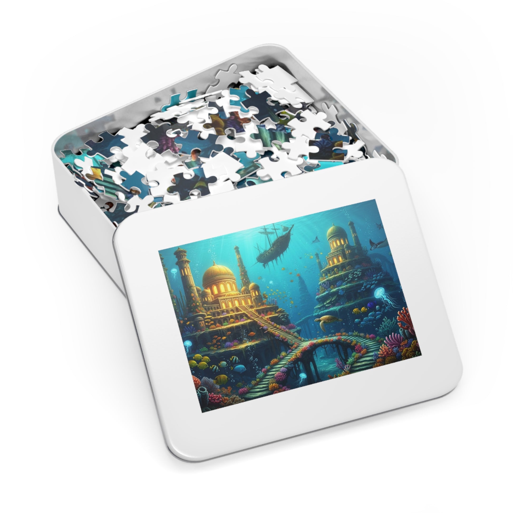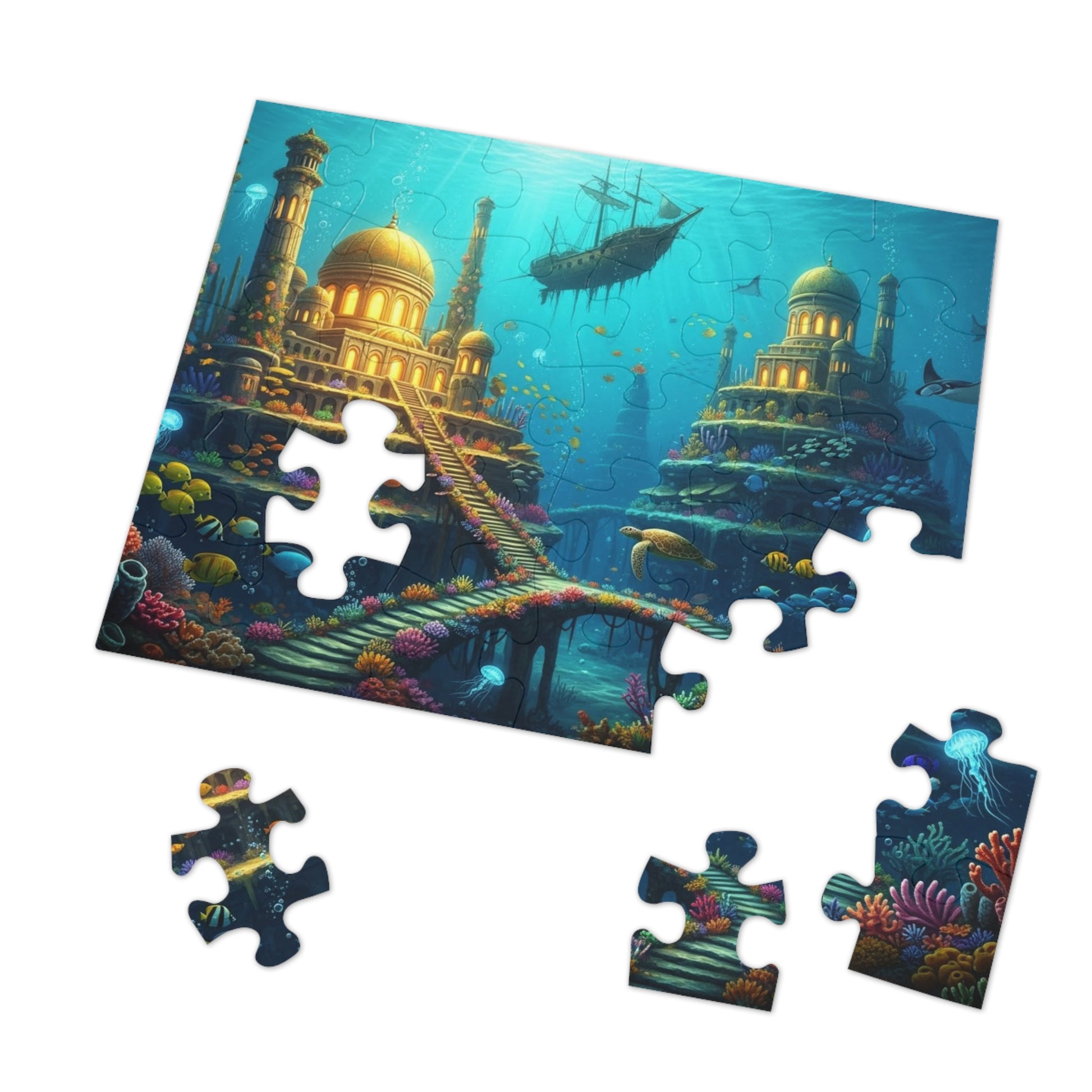 ✨ Dive into a breathtaking underwater fantasy where ancient golden palaces rise from coral gardens and glowing sea paths wind through a living ocean kingdom. This stunning jigsaw puzzle captures a mythical submerged civilization, illuminated by sunbeams filtering through crystal waters, surrounded by colorful fish, drifting jellyfish, graceful rays, and a majestic sea turtle gliding across coral bridges.